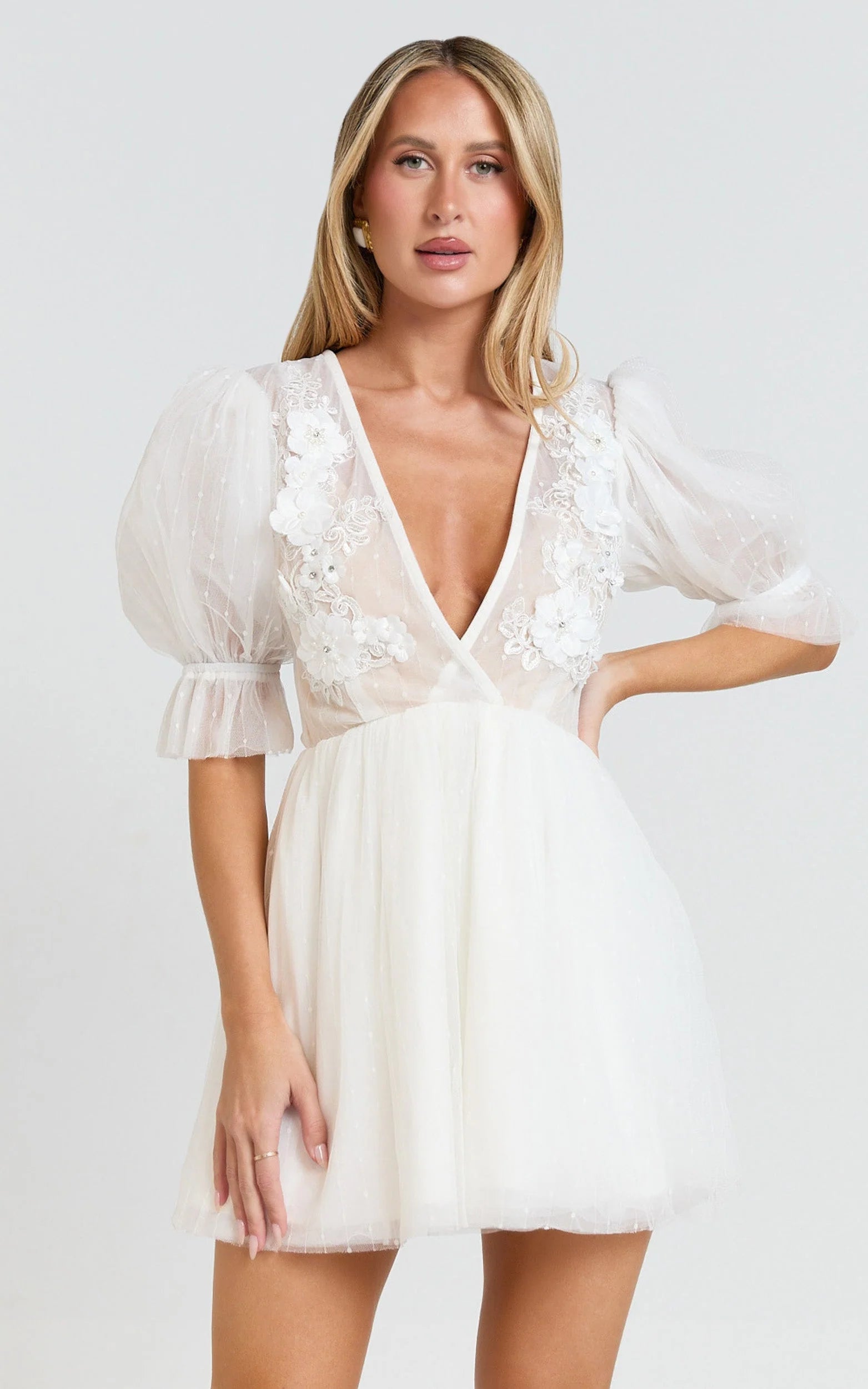 With dreamy puff sleeves, delicate floral detailing, and a flattering plunge neckline, this mini dress brings Y2K nostalgia right into today's romantic runway trends. Its fresh white shade makes it a versatile wardrobe essential, perfect whether you're off to brunch dates or garden parties.