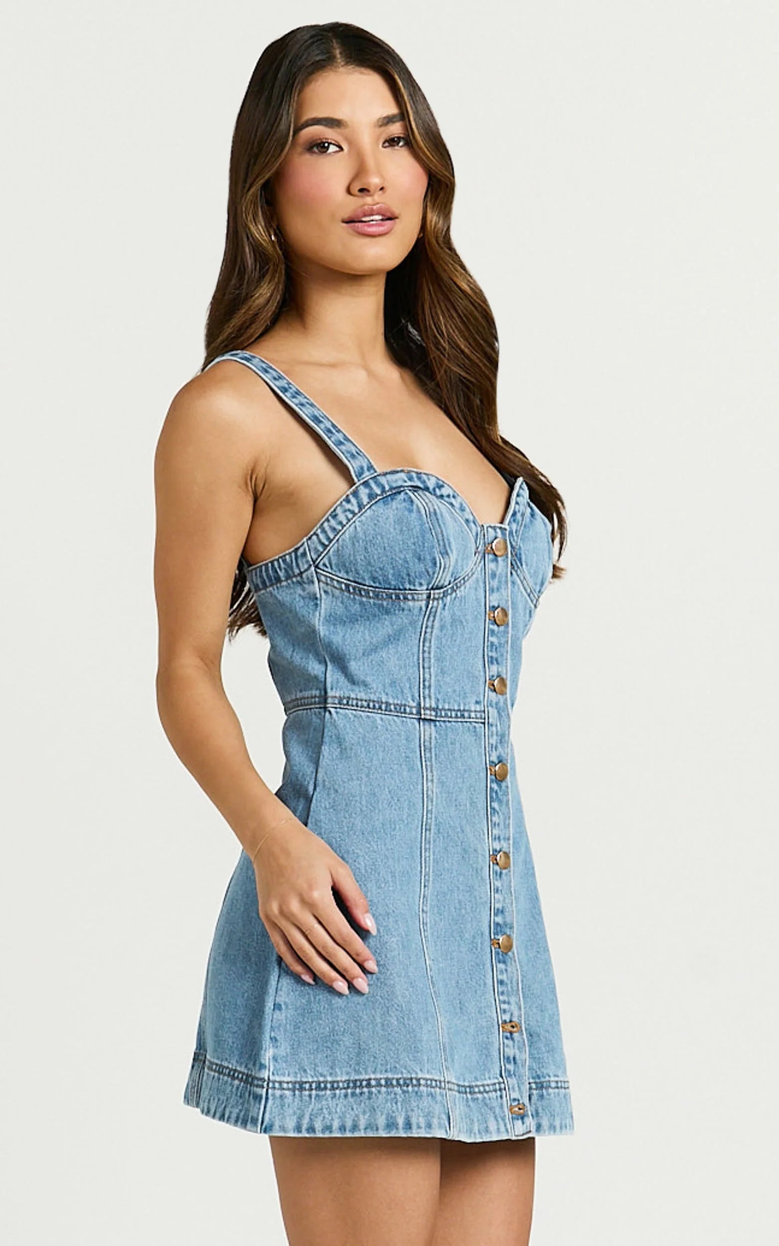 Transform your look with the irresistible Alena Mini Dress. This sweetheart button-down, sleeveless bodycon dress is a game-changer in the world of casual chic. Made from a comfortable cotton blend and designed in a must-have mid blue wash denim, it's the perfect blend of timeless style and modern flair. Whether you're grabbing coffee with friends, heading to a casual date, or exploring the city, this dress will make sure you're doing it in style.