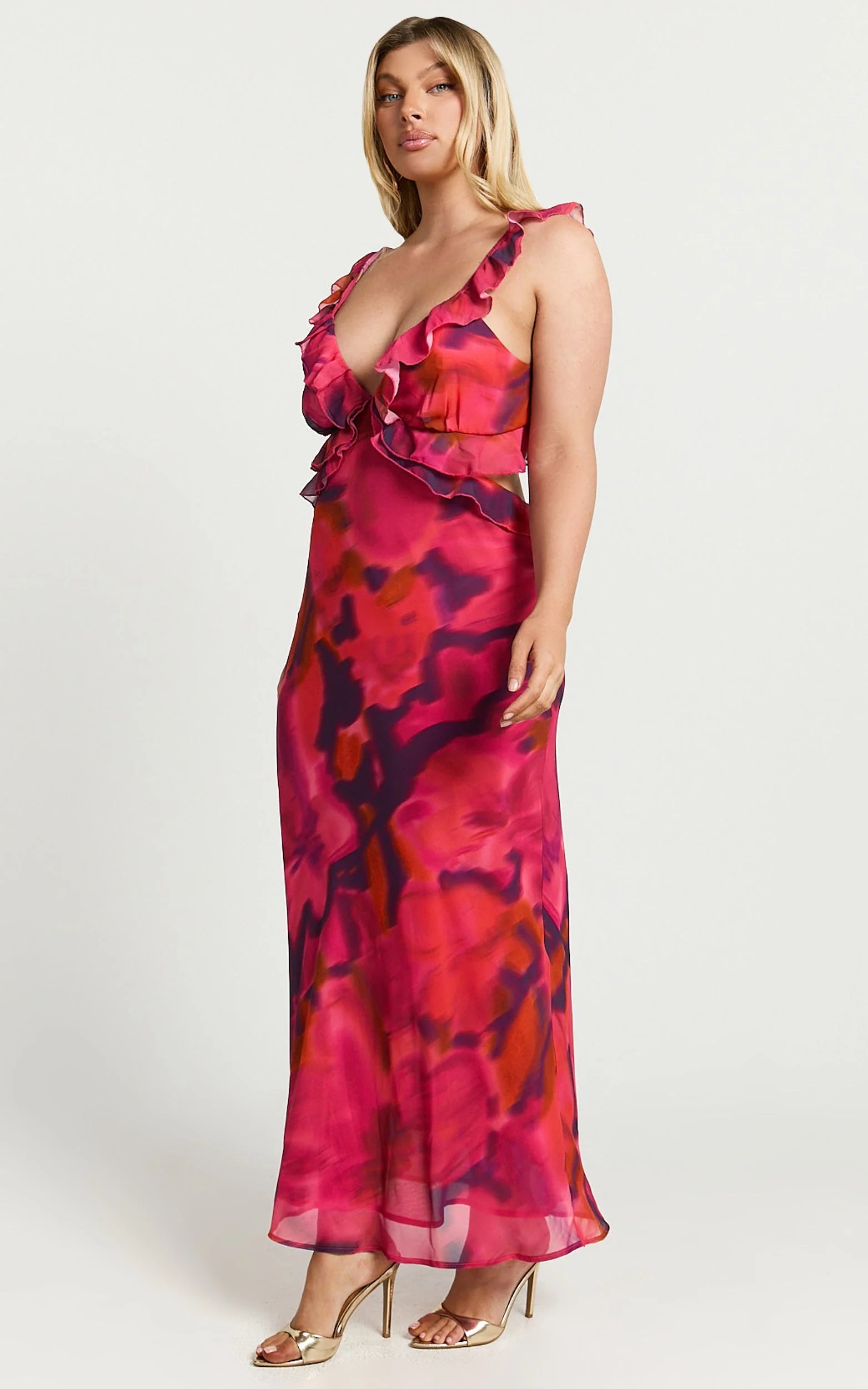 Featuring a flattering V-neckline, delicate frill details and an empire waist that hugs your figure just right, this dress was made for turning heads. The vibrant Adeana print with striking pops of red instantly energizes your wardrobe, while the chic back cut-out adds the perfect touch of playful charm.