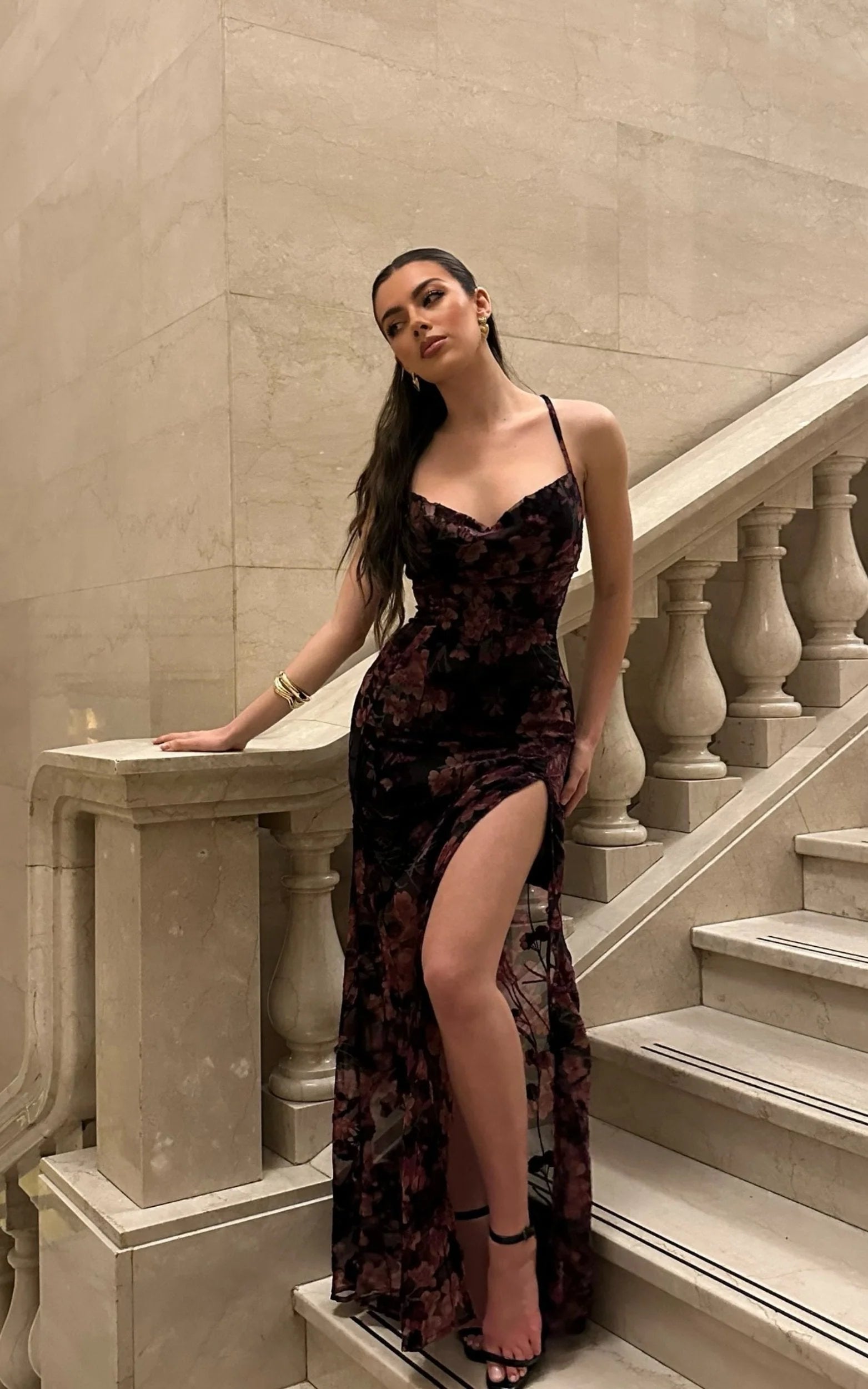 The Aletta Maxi Dress in Aletta Burn Out Floral stuns with a slinky cowl neckline, strappy crossover back, and a body-skimming silhouette that glides from dinner to dance floor. With its artisanal burn-out floral finish and rich black base, it brings cocktail-ready ease with a special-occasion feel, perfect for birthdays, bridesmaid duties, or any after-dark RSVP. The open back and soft drape add sleek drama, while the maxi length elongates your frame for an elegant, confident finish. Style with barely-there heels and a sleek clutch, then add statement earrings to complete the look. Black keeps it versatile; the texture keeps it unforgettable.