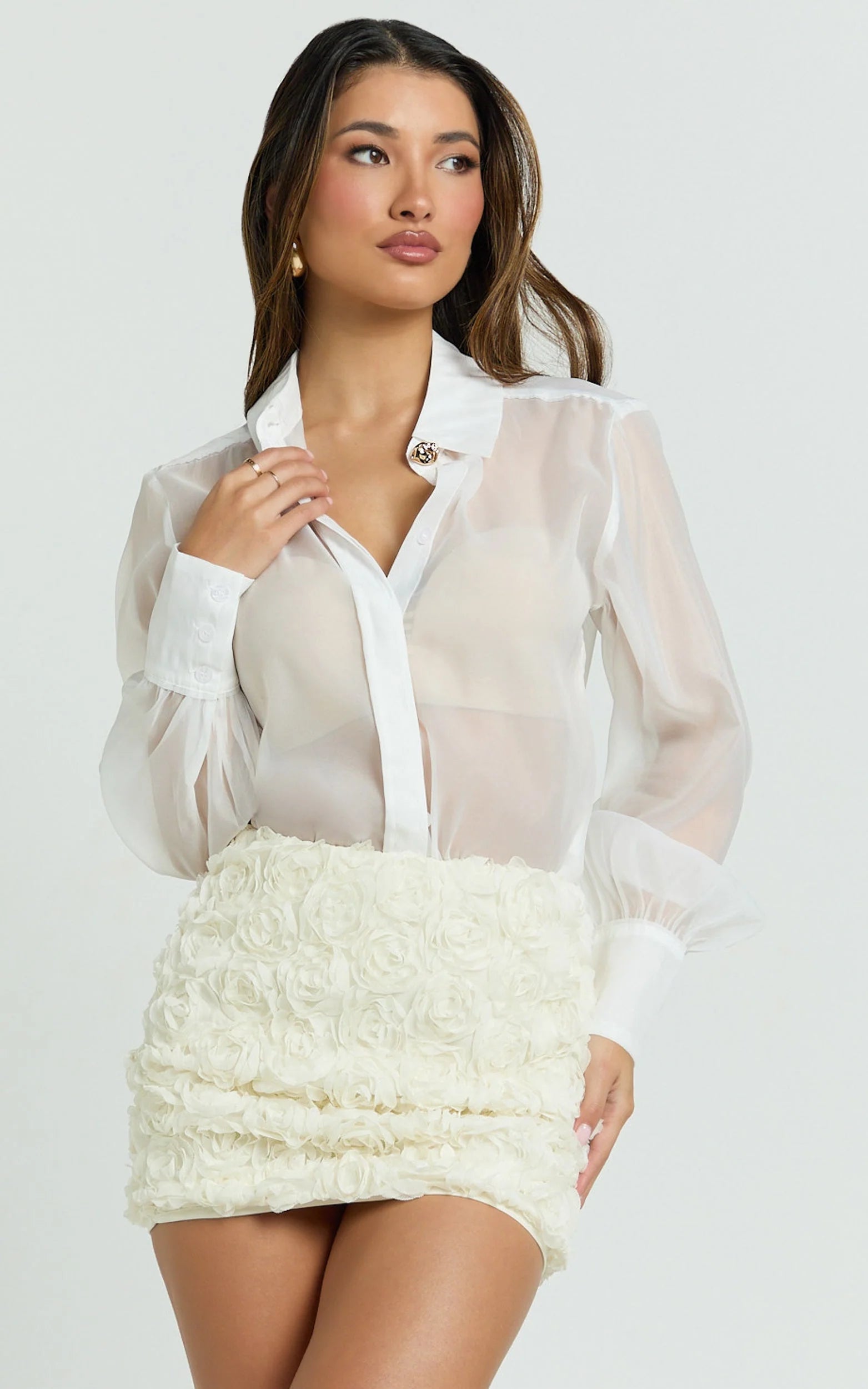 Style the Alvana with tailored pants or a White Tank Top layered underneath for contrast, then finish with Pendant Necklaces for a chic, polished look. Whether you’re dressing up denim or pairing with a mini, this button-up blouse in White brings instant polish and versatility.