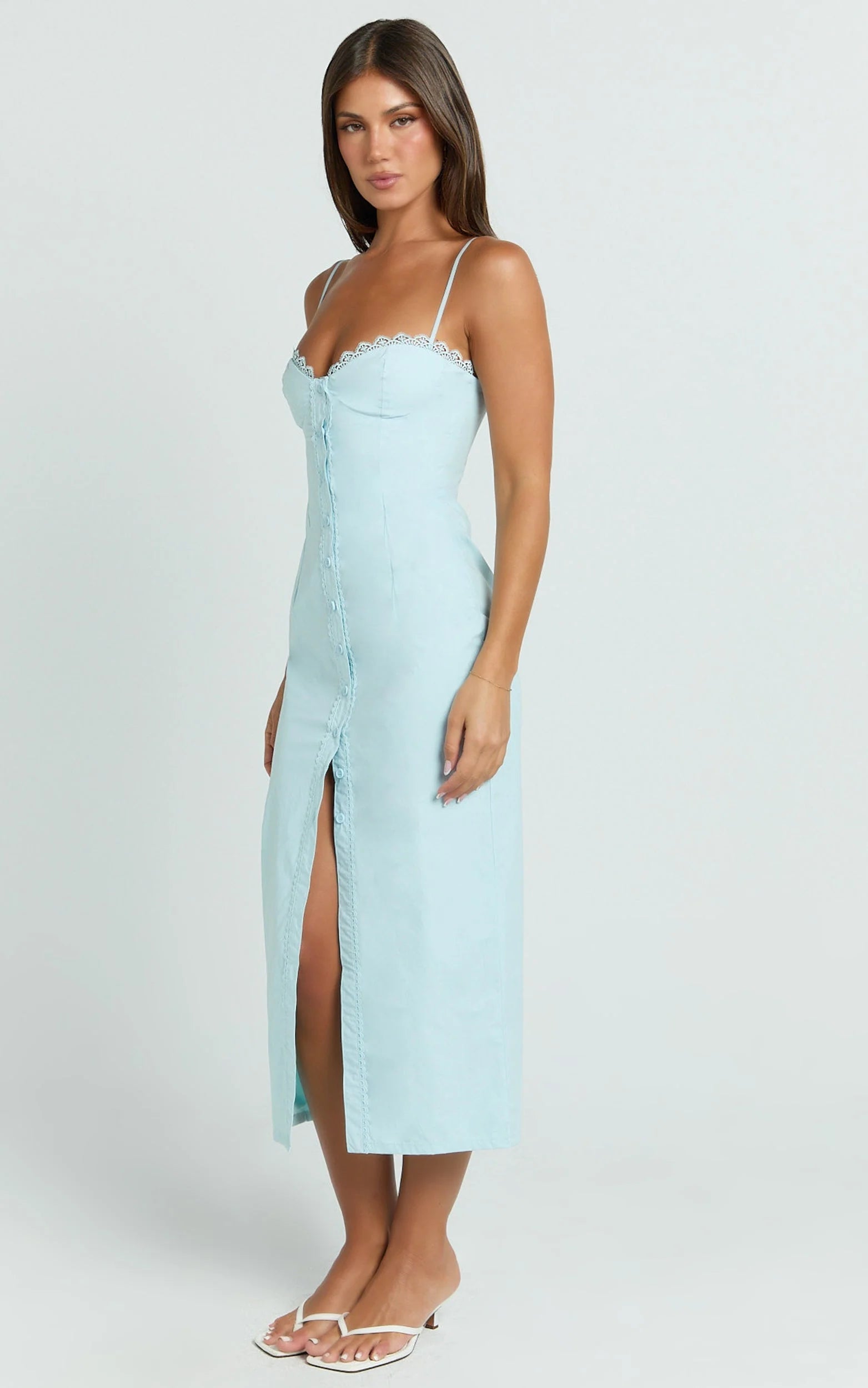 The Anessa Midi Dress in Blue is that polished-but-flirty piece your wardrobe has been missing. The bustier bodice cinches the waist just right, and the fitted midi skirt creates a long, sculpted silhouette without feeling too formal. The button-front detail adds a little attitude - wear it closed for a sleek finish or undo a few buttons for a subtle leg moment. Style Anessa with strappy heels and a mini shoulder bag for dinner plans, or go low-key chic with gold hoops and a slick bun to let the stunning blue shade do the work. It’s modern, flattering, and the kind of dress you end up wearing way more than you expect - a true repeat favourite.