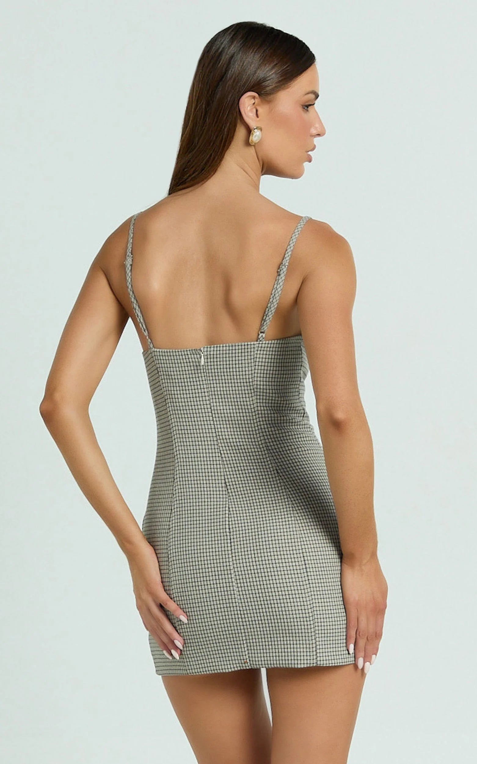 Body-hugging silhouette. Beige check that goes with literally everything. This mini is your instant “out-out” hero, flirty, fitted and ready for last‑minute plans. The checkered print gives that cool-girl edge while the neutral palette keeps it effortlessly versatile across your favourite Dresses edit. Style it with Patent-leather pumps and a Small shoulder bag for drinks, or add Shield sunglasses for daytime sass, either way, you’re set.