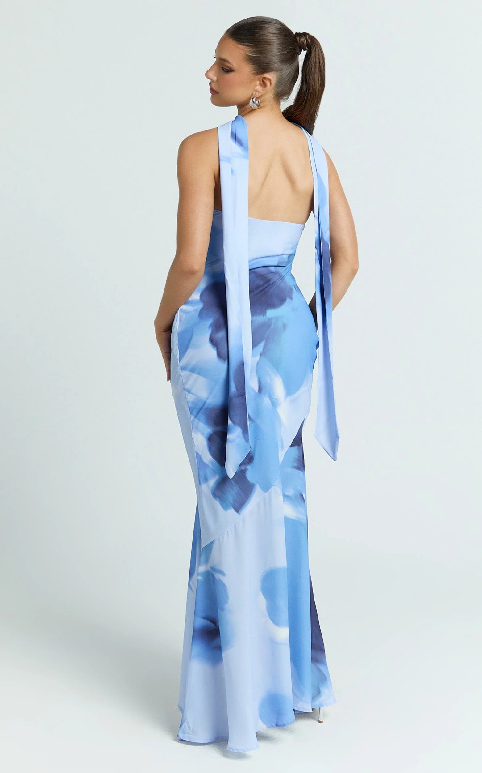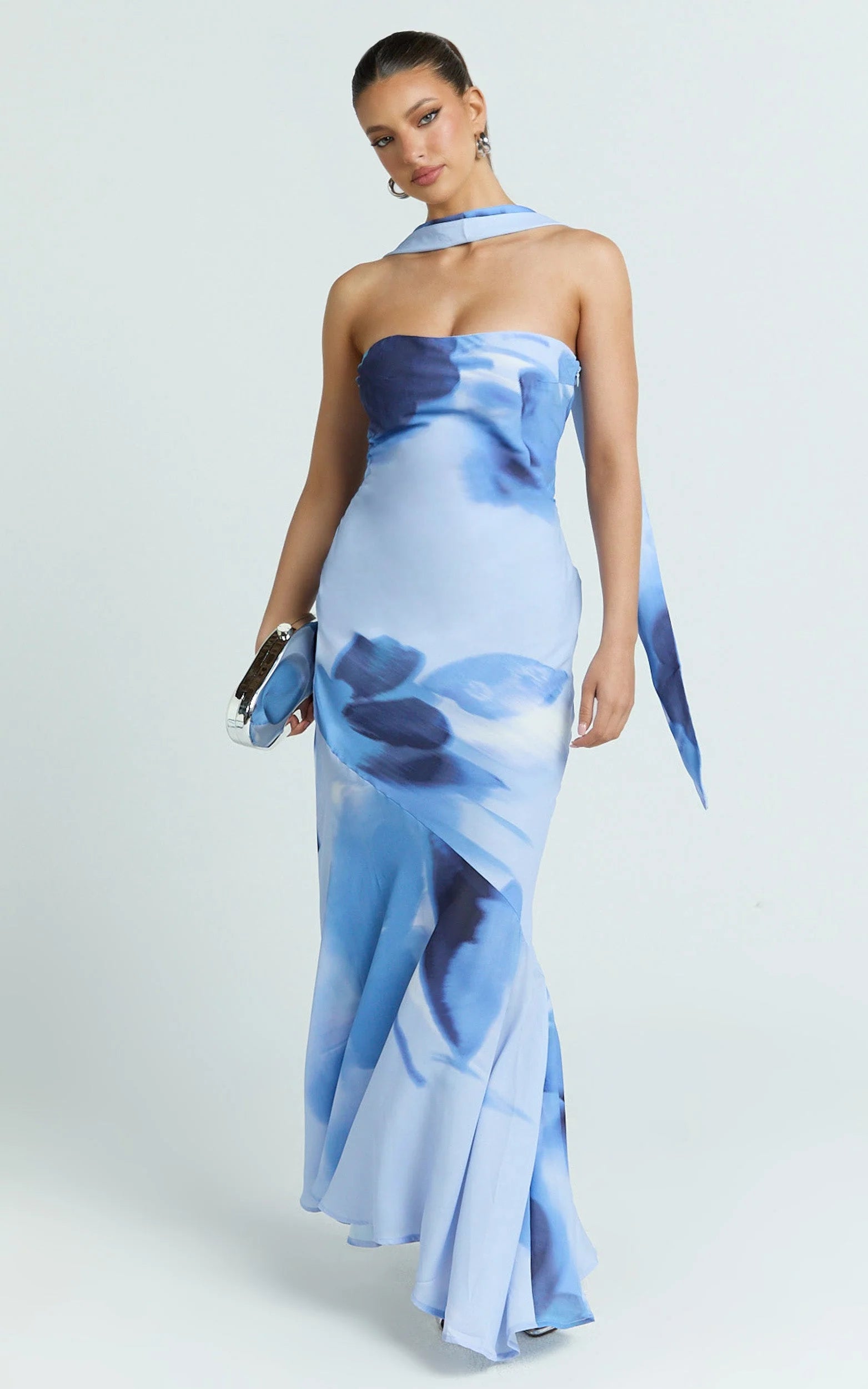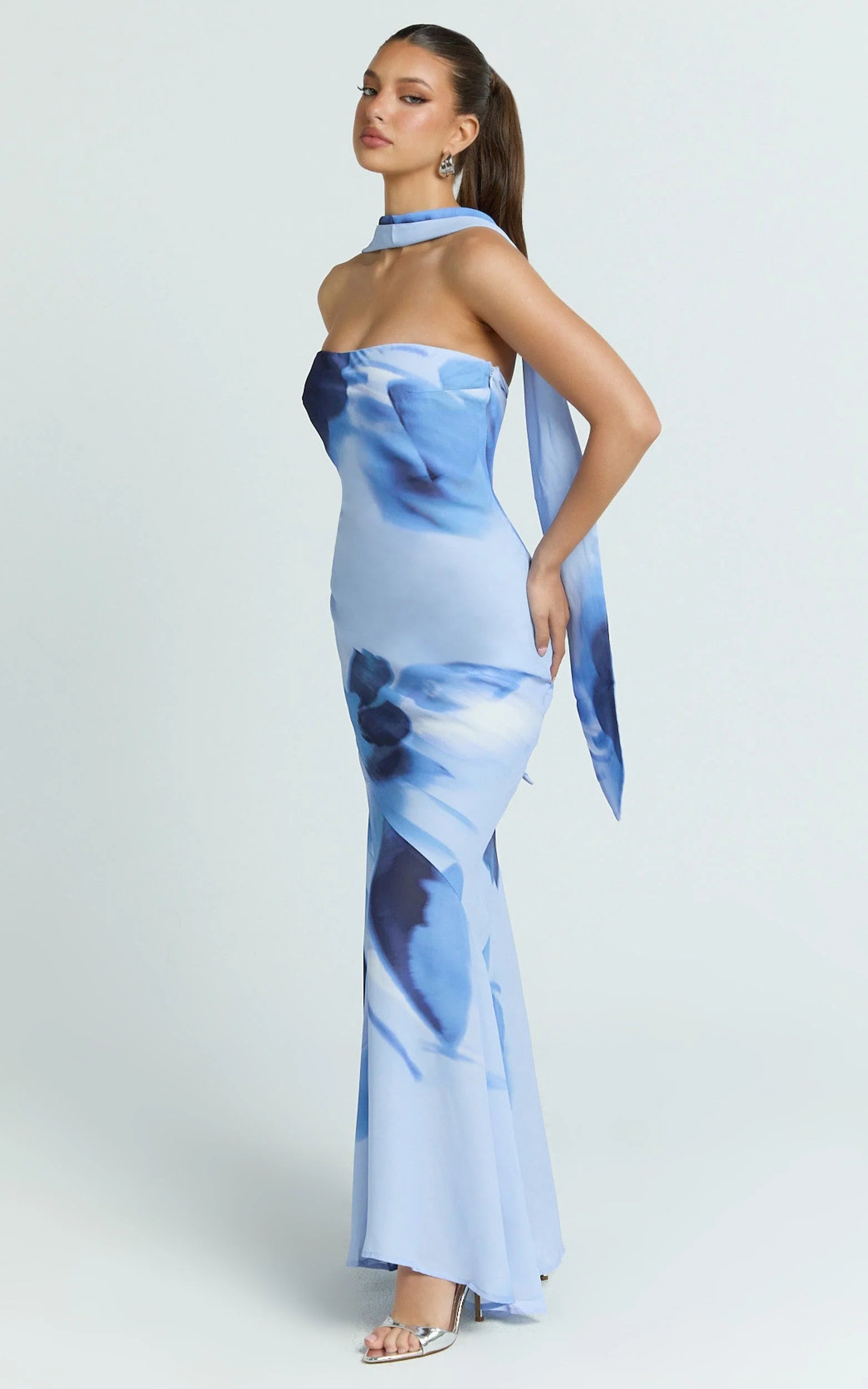 The blue print brings a fresh pop to your Dresses lineup, while the detachable scarf lets you play with layered styling, draped, tied, or worn as a hair accent. A true statement piece for nights out, weddings or long lunches, it moves with you and photographs like a dream.