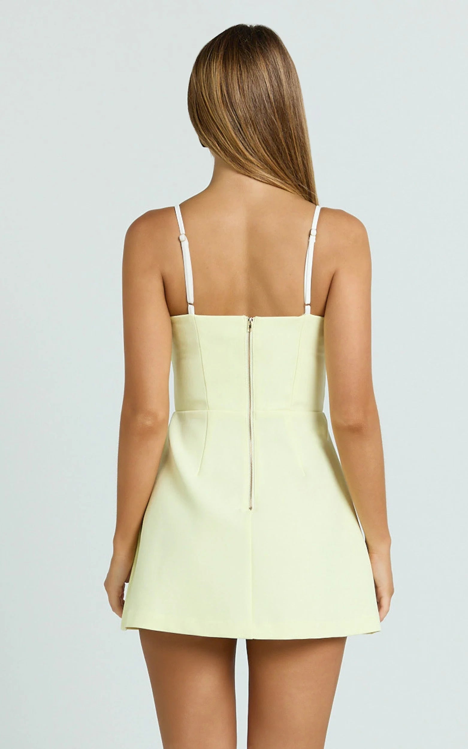 Anna Mini Dress - Contrast Neck Tulip Skirt Dress In Lemon And White taps into current trends with a nod to sheer skirts styling energy and the polish of metallic sunglasses. Style it with delicate jewellery and barely-there heels for a clean, high-shine moment, or keep it casual with mesh flats and a mini shoulder bag. Effortless, eye-catching, and made to be seen.