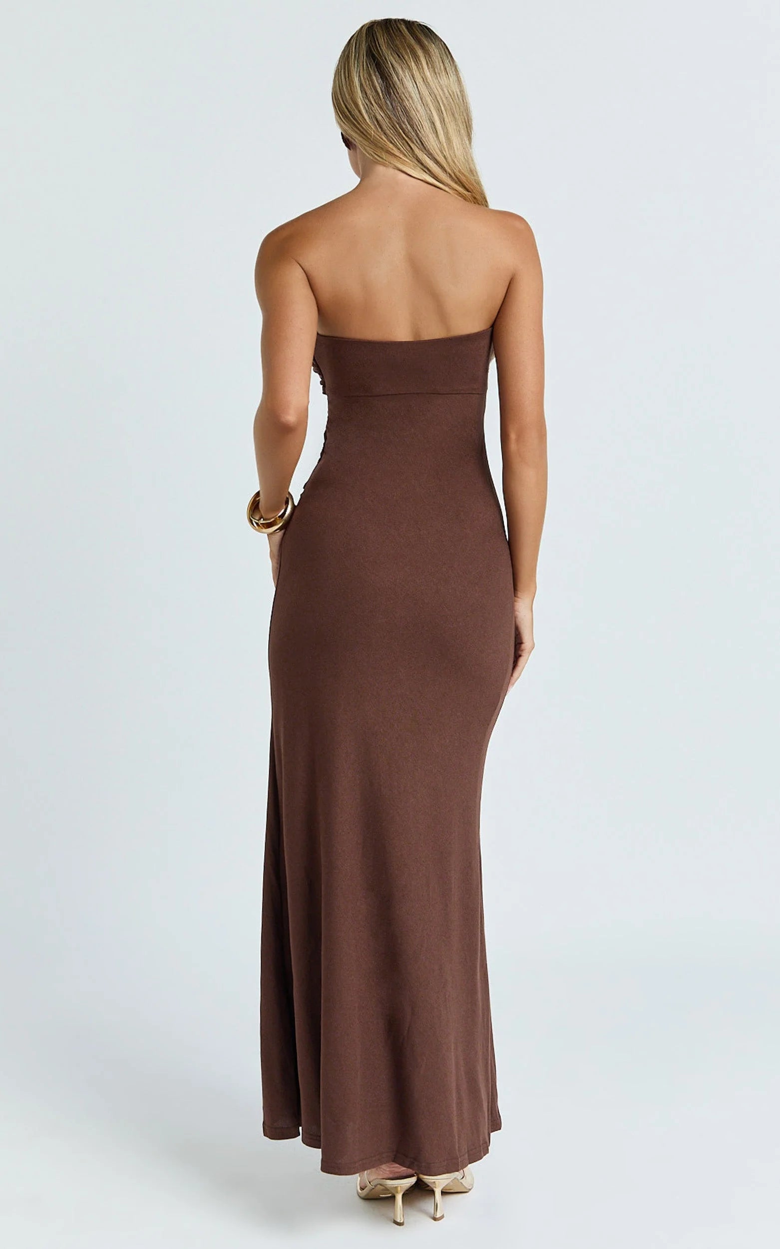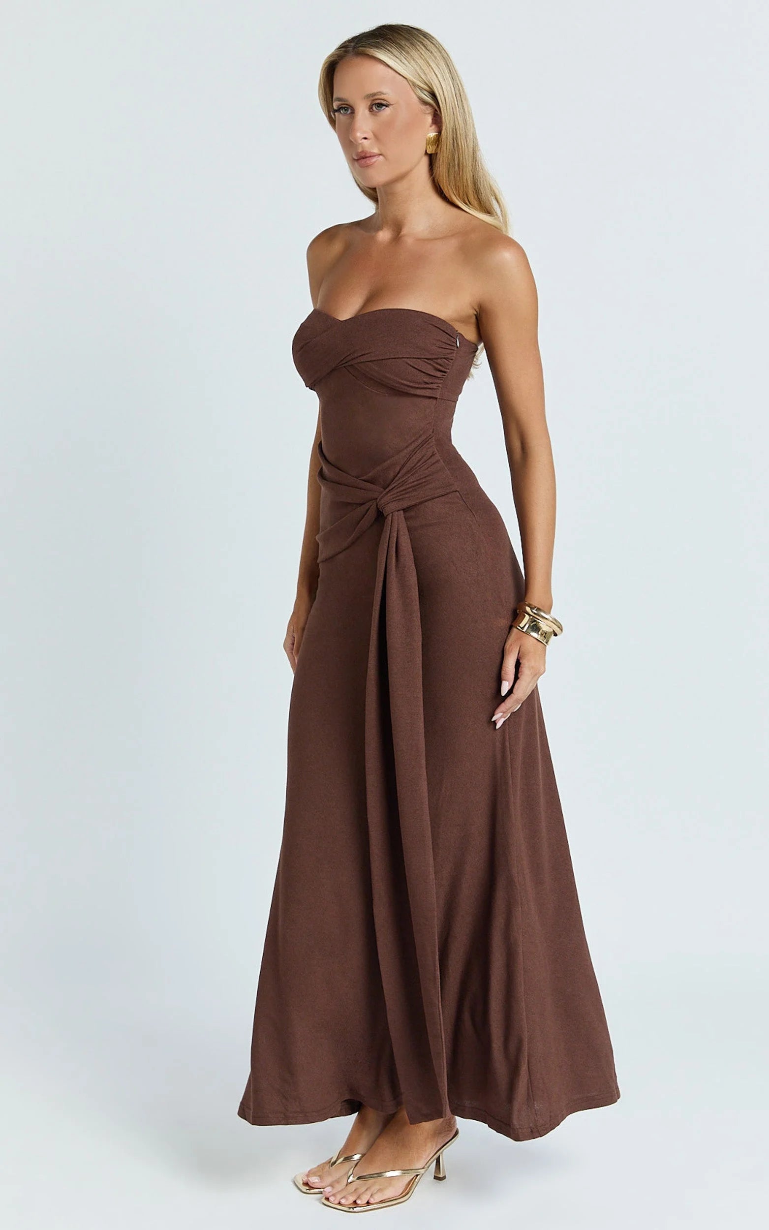 Aria Maxi Dress - Strapless Tie Waist Dress In Chocolate elevates your Dresses rotation with a flattering, minimal cut that lengthens the frame and feels instantly dressy. Style it with Oversized Bags for a modern proportion play or add High Shine accents for a glam finish. This Dark Brown tone is versatile, pairing back with nude heels or strappy Minimalist Thongs for an easy, legs-for-days look.