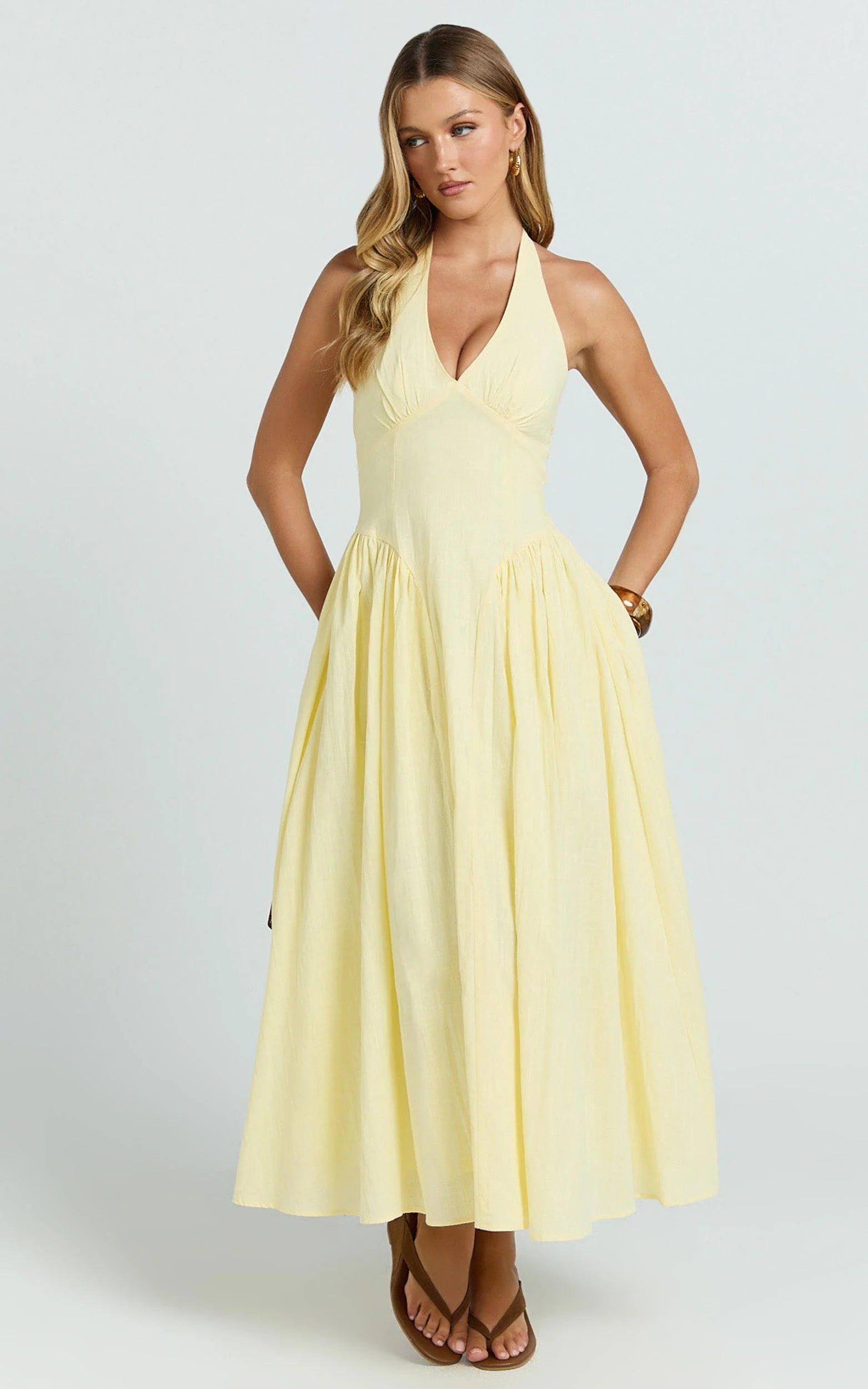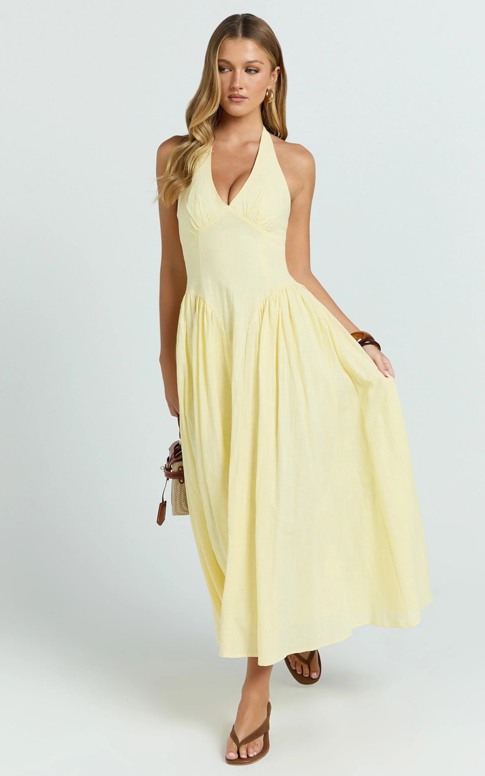 This halter drop waist midi turns heads with a soft lemon hue and flowy silhouette that skims and swishes in all the right places. The drop waist gives effortless elongation while the halter neckline frames your shoulders, perfect for long lunches, garden parties, or a beach-to-bar glow-up. Think Dresses that do the most with minimal effort.