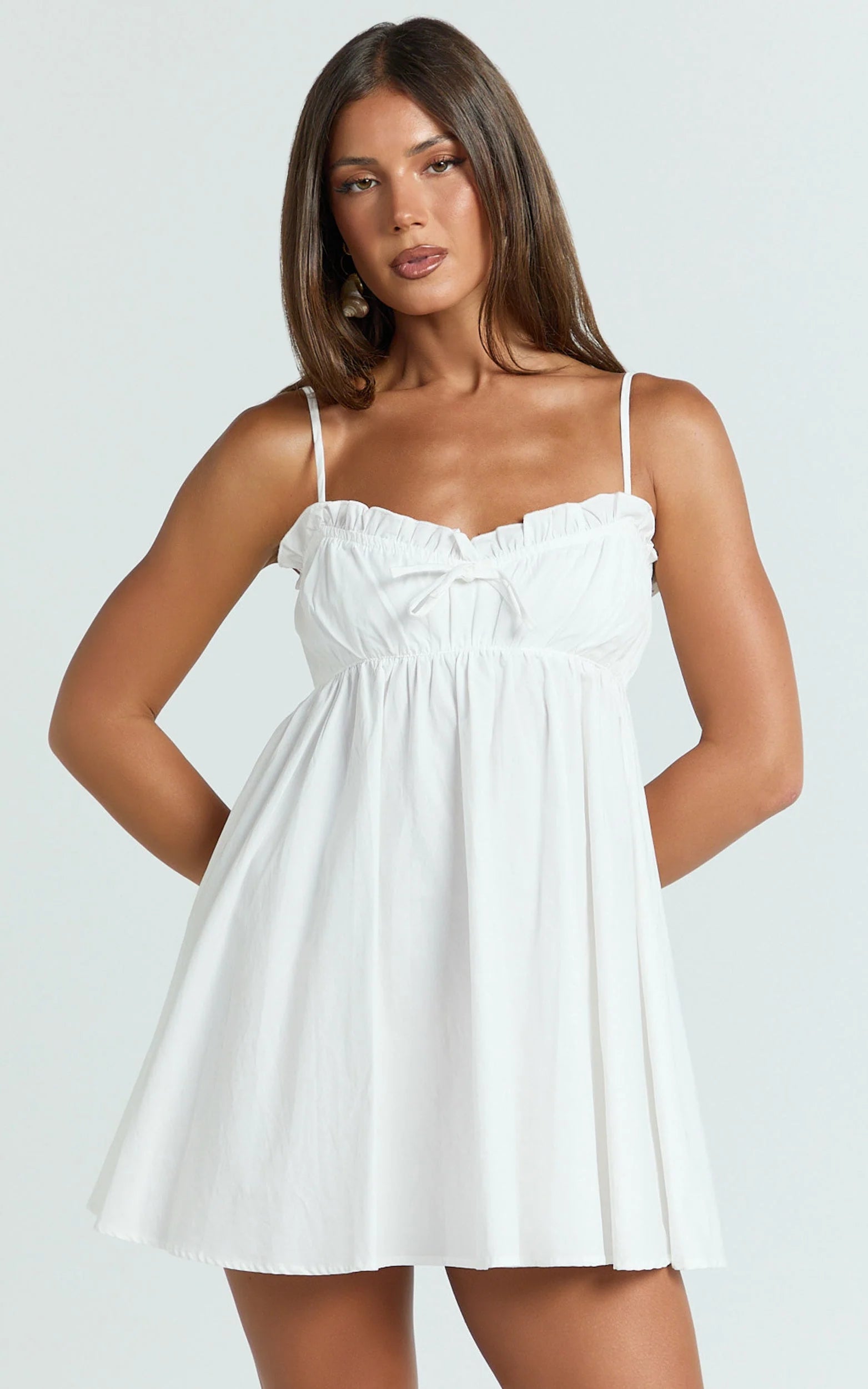 The Augustine Mini Dress in Off White is the definition of sweet-but-effortless energy. With its soft frill trimming and floaty babydoll fit, it brings that light, swishy movement that feels dreamy from every angle. The strappy neckline keeps things delicate, while the relaxed shape is comfy enough to wear all day without thinking twice. The off-white tone gives it that fresh, romantic feel—perfect for soft girl styling or a modern cottagecore moment. Wear it with ballet flats and a ribbon in your hair for something cute and flirty, or elevate it with gold hoops and kitten heels for date night. Pretty without trying too hard, Augustine is an instant add-to-cart.