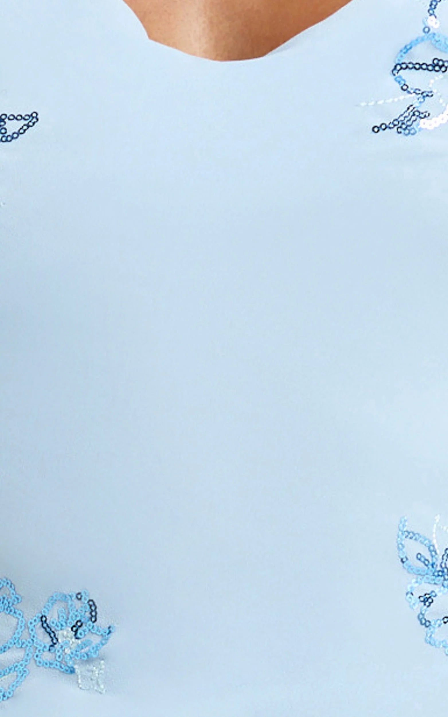 With a stunning sequin floral design in an ethereal baby blue hue and an elegant cowl neck detail, you’ll be channeling pure Euro summer style at any event, think beachside soirées to rooftop parties.