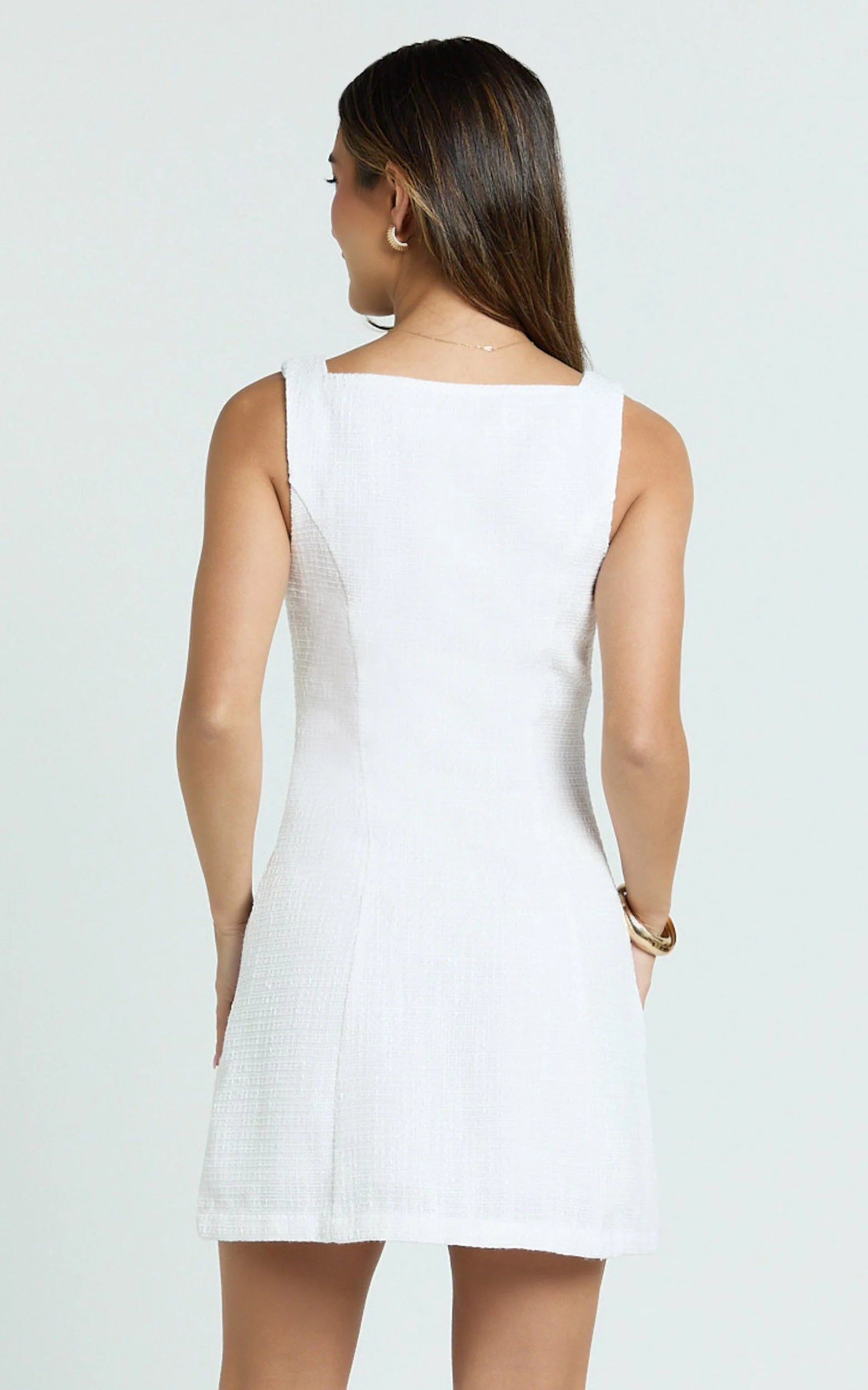 Crisp white and tailored with a button front, this mini lets you channel quiet luxury while keeping things playful for brunches, beach escapes or rooftop cocktails. The defined silhouette flatters from every angle, think chic confidence day or night.