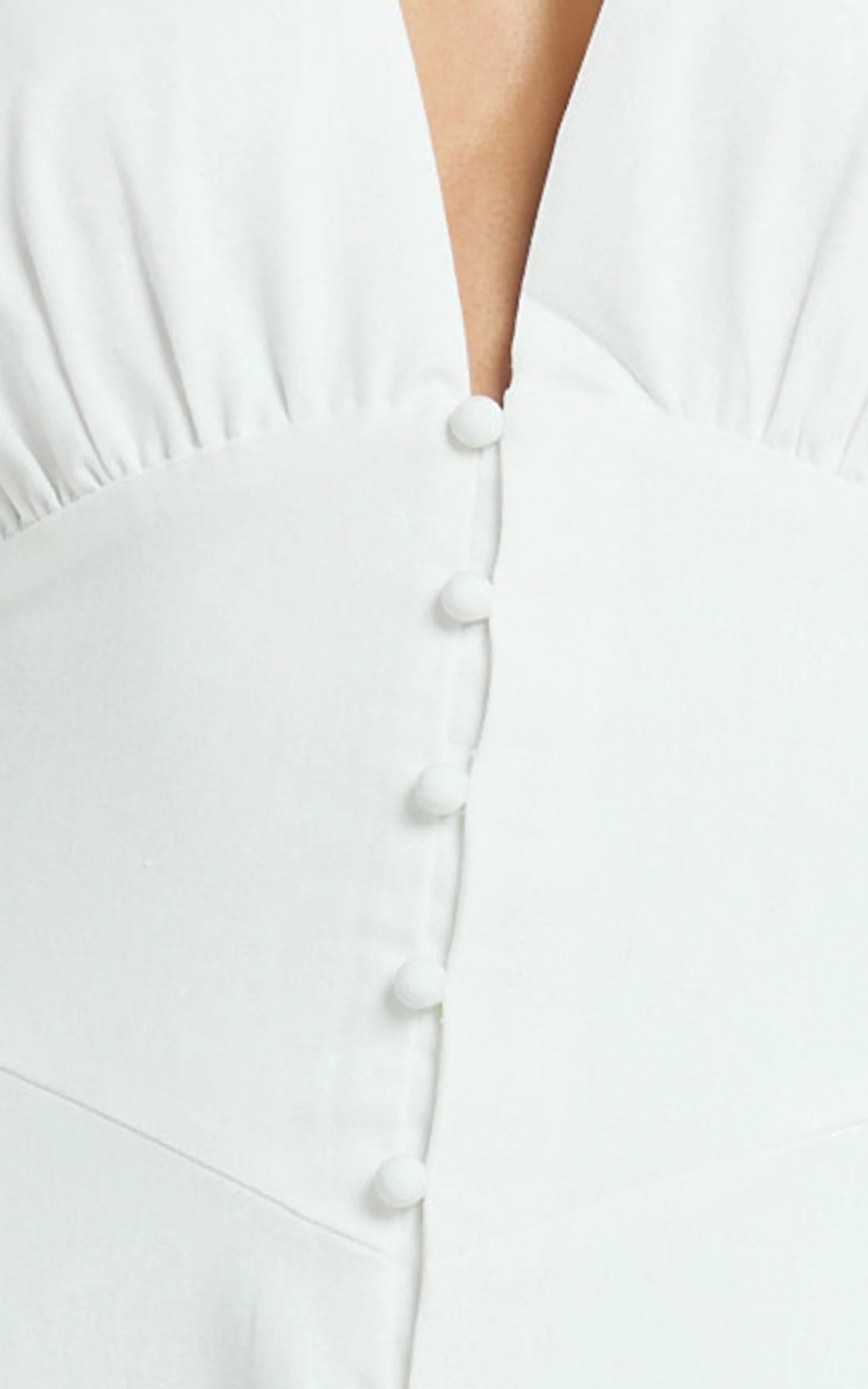 The Beata Maxi Dress in White is giving angel energy with attitude. A plunge halter neckline shapes the bust, the waist pulls you in, and that open back? All drama. The A-line maxi skirt drops soft and long so it feels sleek but still easy to move in. Crisp white keeps her fresh and versatile, think garden parties under the sun, long lunches that turn into rooftop cocktails, or nights out where you want all eyes your way. Nude sandals and simple studs keep it pared back, but metallic heels and bold hoops flip her into full glam. She just works.