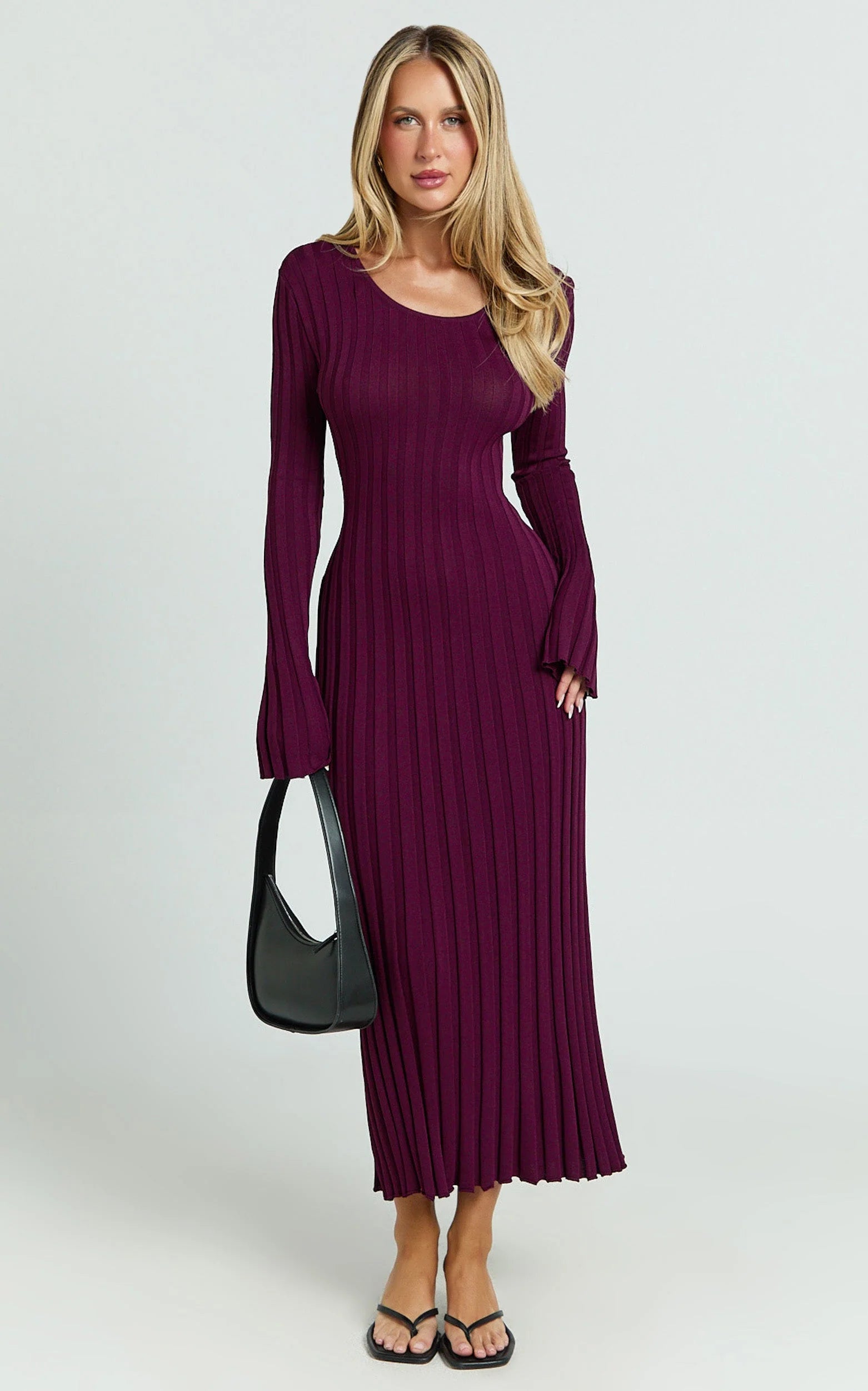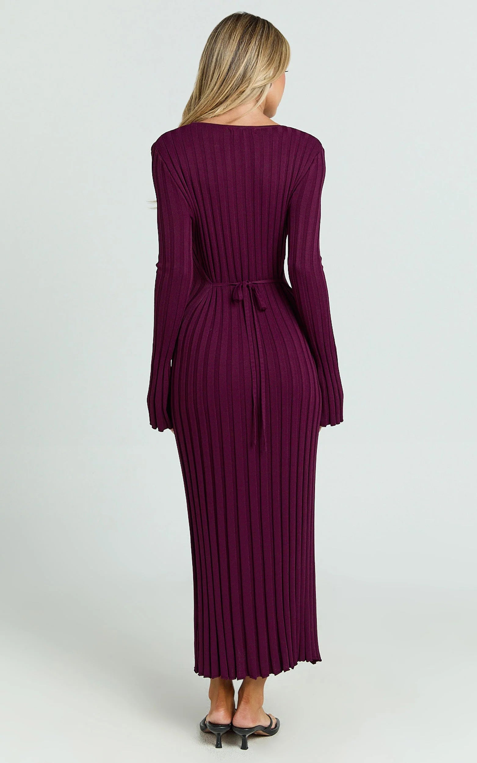 Designed in a rich wine hue, this dress features romantic long sleeves and a stunning tie-back detail that adds a chic twist to your look. Its flared midi skirt creates subtle vintage charm paired with a modern maximalist vibe, perfect for turning heads at weekend brunches or glam date nights.
