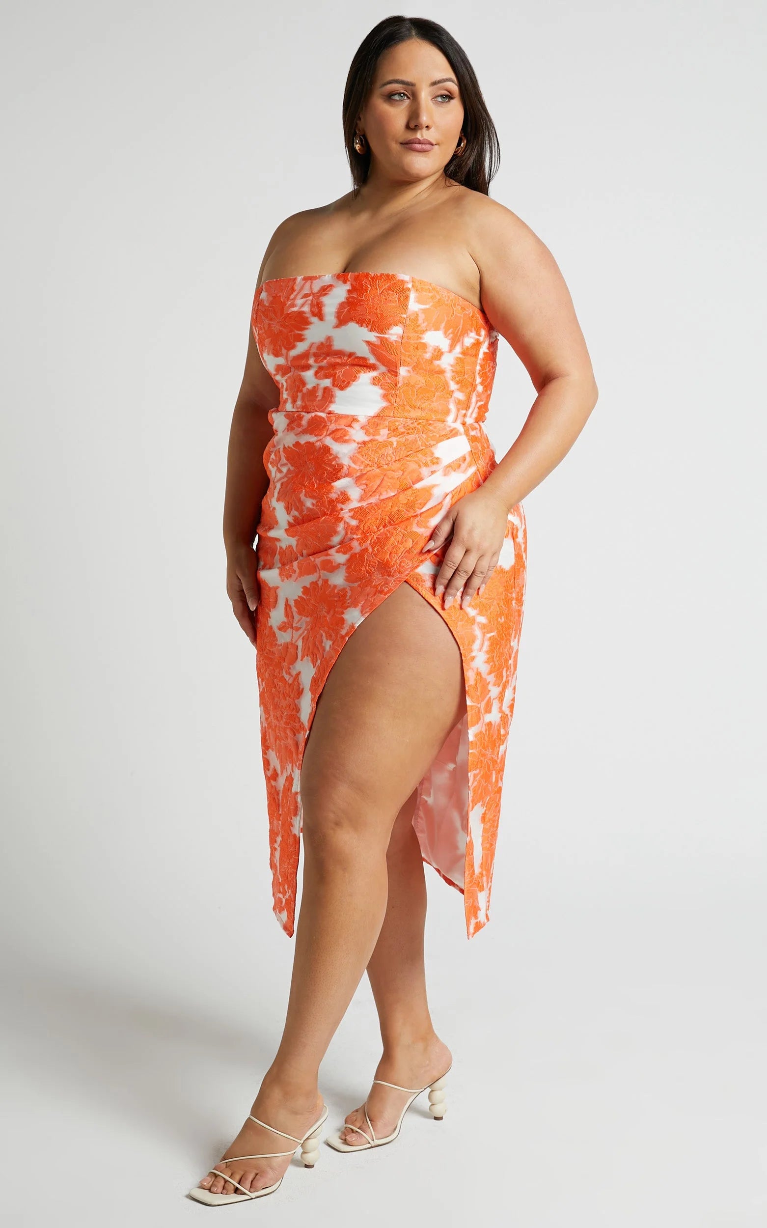 Think our famous Brailey but make it midi! Our sleek but vibrant Brailey Midi Dress has a fitted strapless bodice and fixed-wrap pencil skirt with a thigh split - plus the signature Brailey floral jacquard finish. A fresh take on a bestseller, it's a guaranteed hit for your next cocktail party, fancy dinner date or special occasion. Wear it with strappy heels and lightly styled hair for a summer party look!