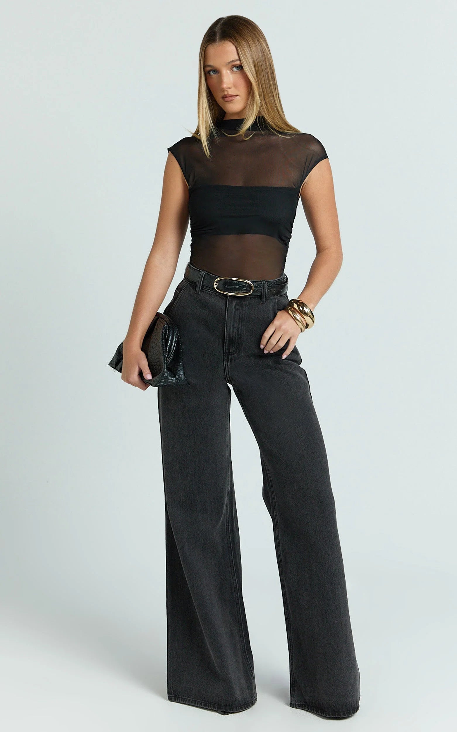 The Brayden Bodysuit in Black is sleek, fitted, and ready for anything. The high neck and cap sleeves keep the lines clean under blazers or denim, while the sheer finish adds that subtle, sultry edge - think modern leotard vibes with just the right amount of coverage. Made for easy styling, it pairs perfectly with tailoring for a polished moment or relaxed denim for off-duty cool. Dress it up with a pendant necklace to highlight the neckline, or keep it minimal and let the silhouette do the talking. Effortless to tuck, zero bulk, and maximum impact - this bodysuit is your new go-to base layer for every look.