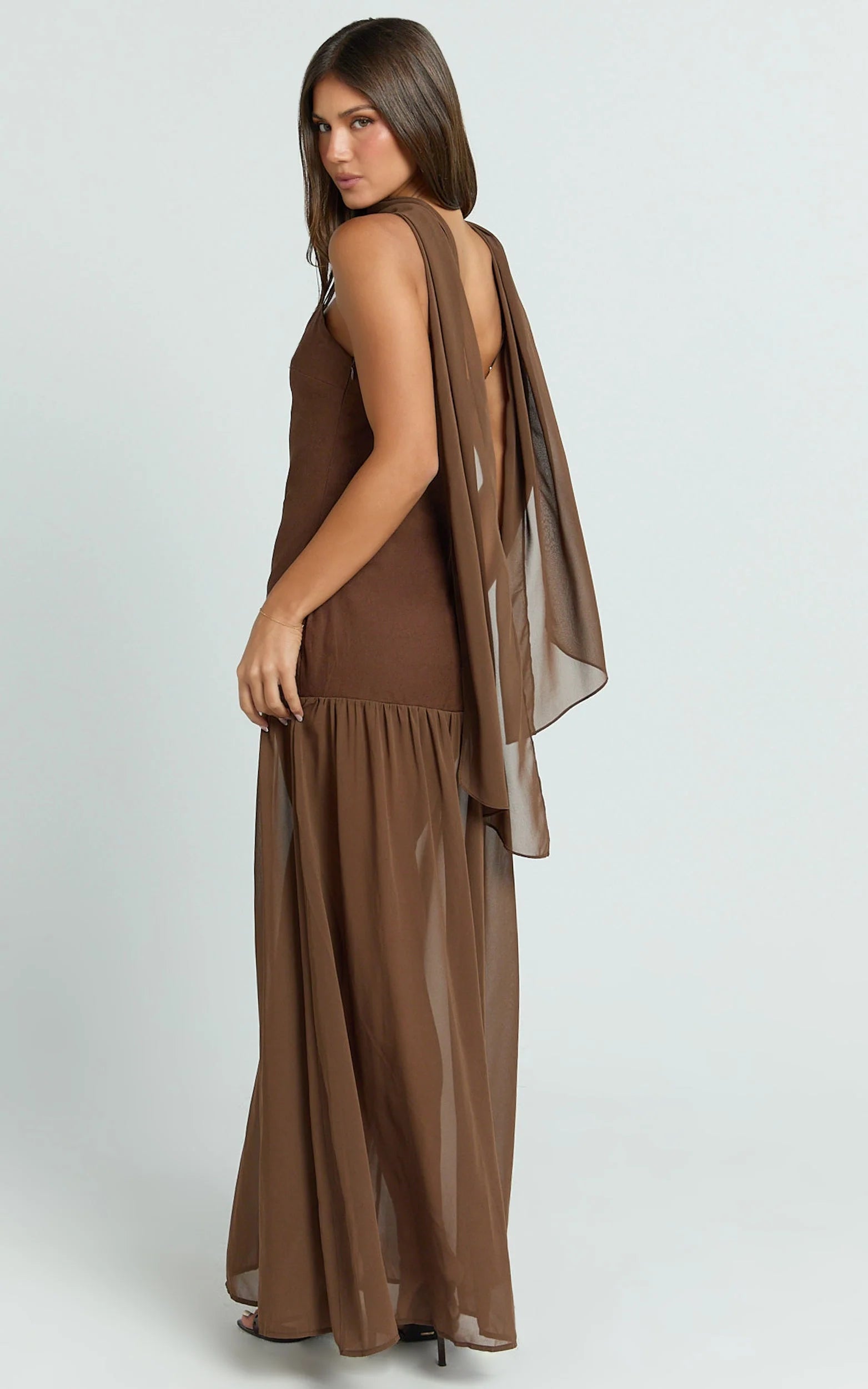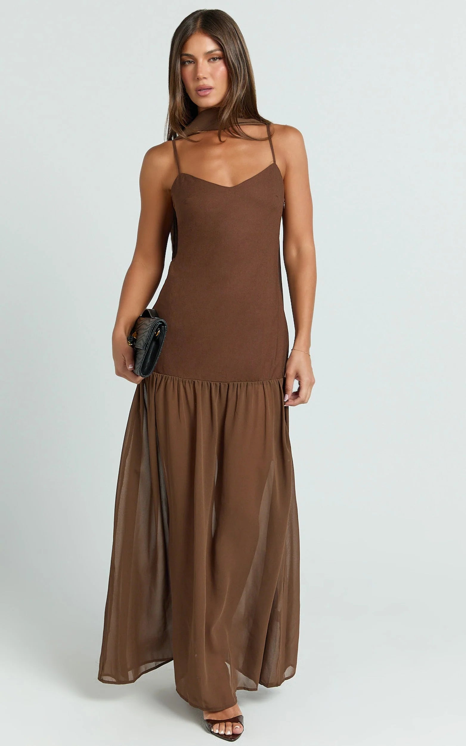 Calvin Maxi Dress - Linen Look Contrast Georgette Skirt With Neck Scarf In Chocolate brings floaty elegance in a deep, Dark Brown shade that flatters every skin tone. Style it with minimalist thongs for a modern finish or go High Shine with statement earrings and an oversized bag for polished glamour. A timeless silhouette that feels trend-forward and photo-ready from first sip to final dance.
