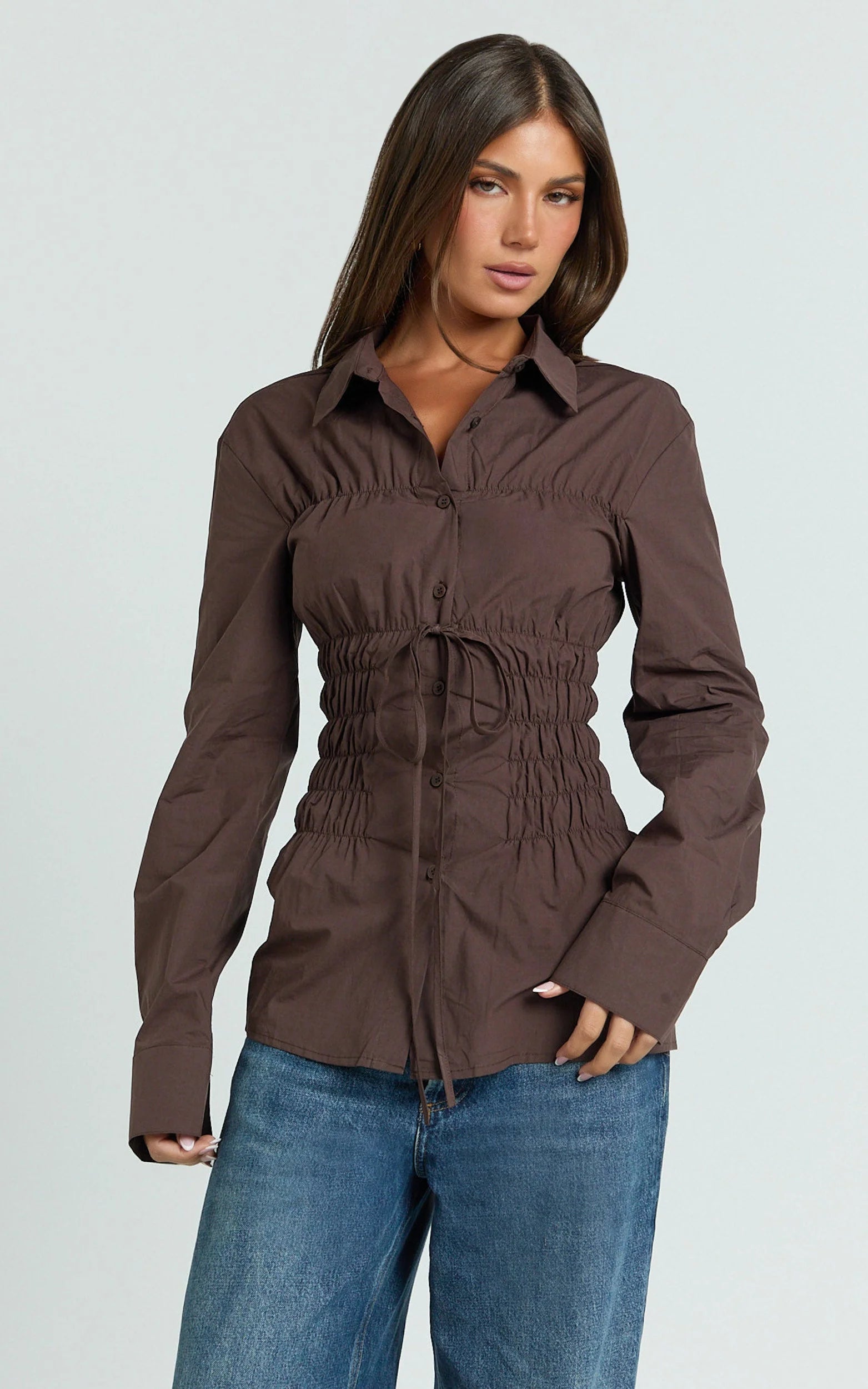 Style Cody with crisp denim jeans for a minimal look, or lean into sleek vibes with tailored trousers and strappy heels. This brown button-up balances cool-girl structure with curve-loving ruching, effortlessly refined, endlessly wearable.