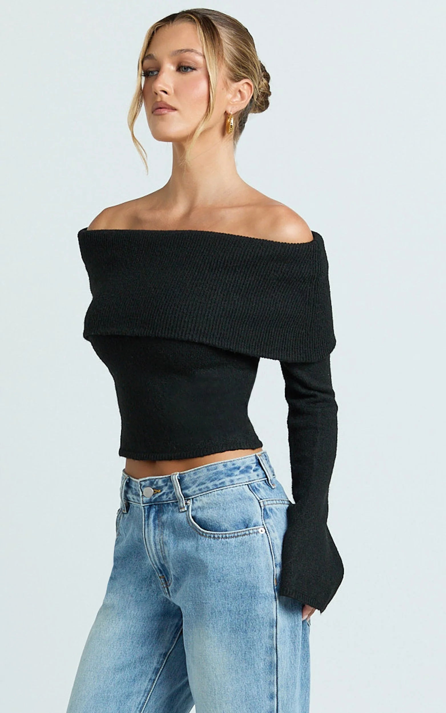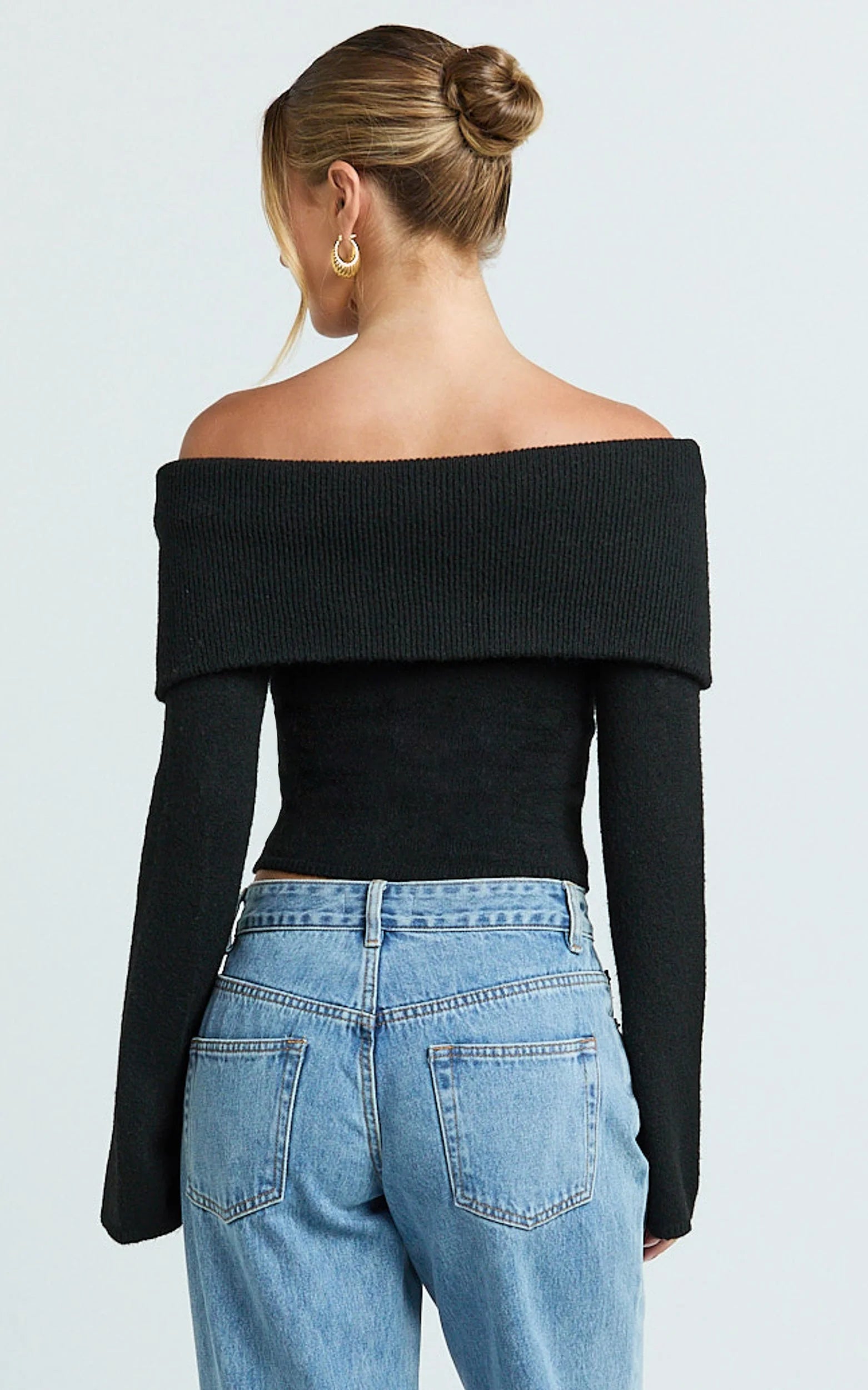 This long-sleeve black knit hugs just right, showcasing collarbones while keeping things sleek and versatile. A wardrobe MVP in our Tops lineup, it’s made for after-dark plans, low-key brunches, and everything in between, polished enough for night, effortless for day. Think minimal lines with maximum impact.