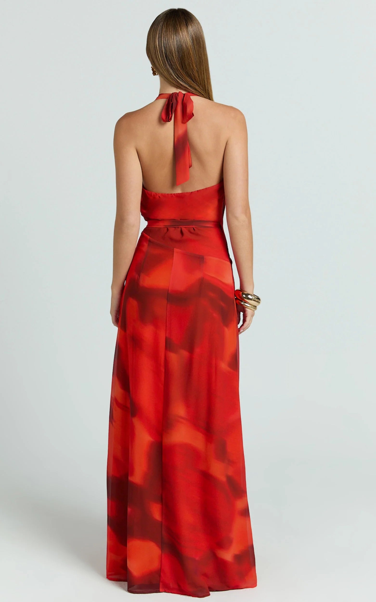 The Eva Maxi Dress in Abstract Adeana Print features a waist-cinching wrap fit and a sweeping skirt that moves with you, made for date nights, events, and every RSVP in between. The deep V neckline and open halter back bring the drama, while the bold, abstract print keeps things high-impact and photo-ready. Consider her your go-to for a look that flatters and feels instantly elevated. Style her with gold heels, a sleek bun, and sculptural earrings for a polished, modern finish, or offset the bold print with soft, sheer accessories for an ethereal twist. This is the bold, body-loving maxi you’ll reach for whenever the dress code says: do the most.
