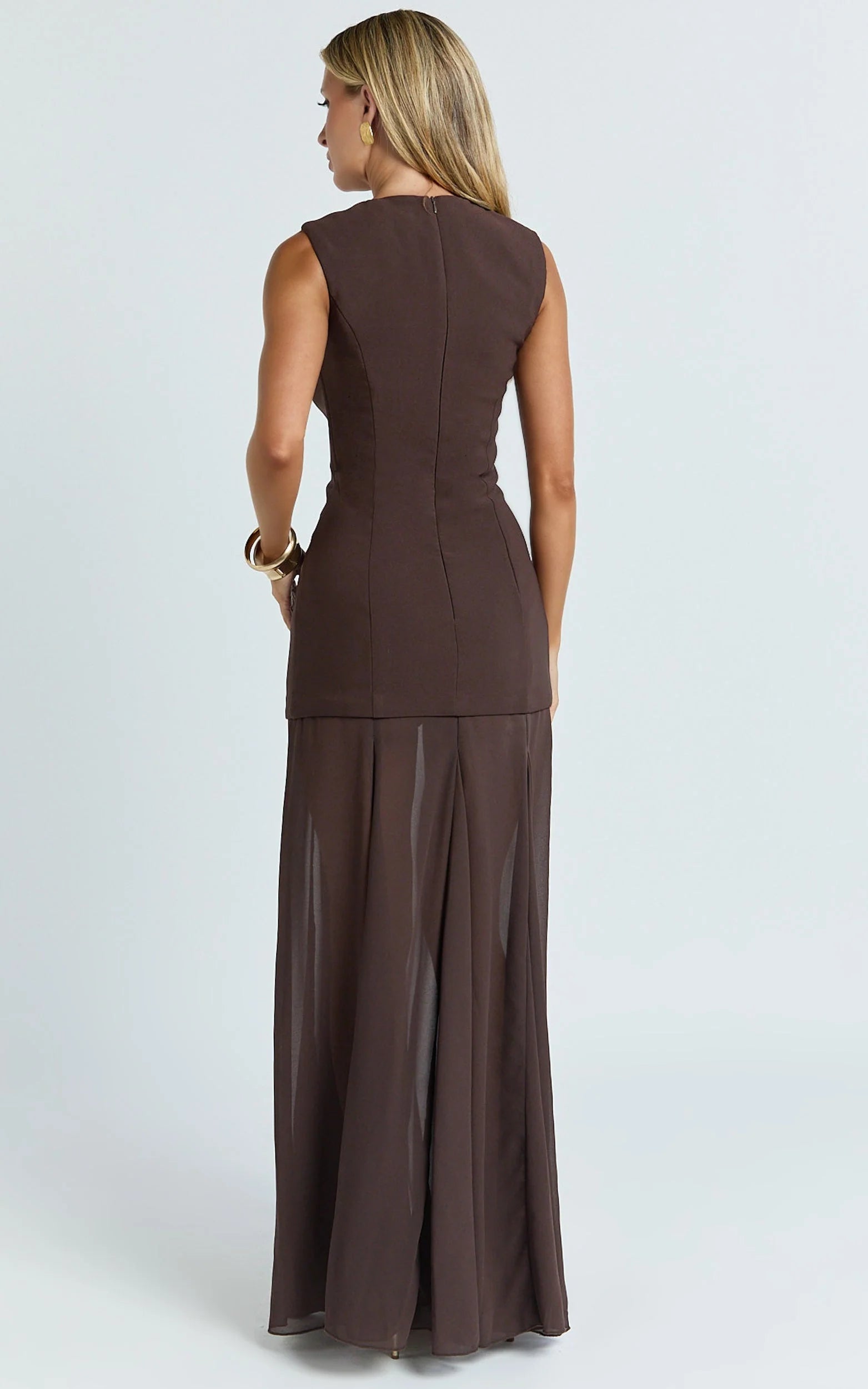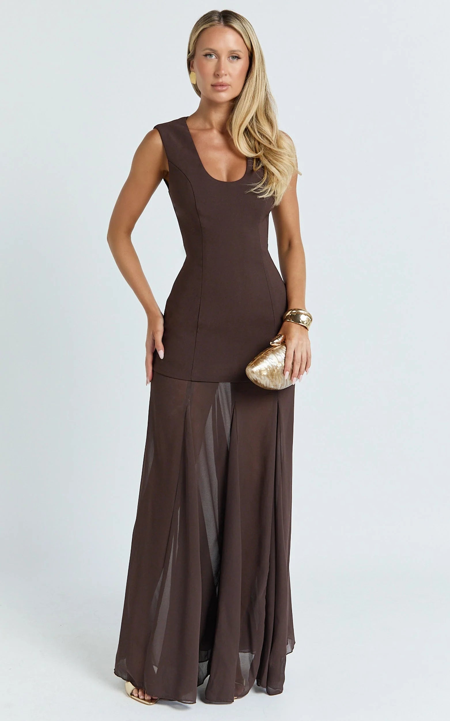 Frances Maxi Dress - Contrast U Neck Godet A Line Dress In Chocolate delivers a waist-defining silhouette that elongates and flatters, giving you that effortless “threw-it-on” confidence. Pair with cowboy boots for a cool twist or delicate heels for classic elegance, this brown beauty is your new go-to in Dresses for when you want maximum impact with minimal effort.