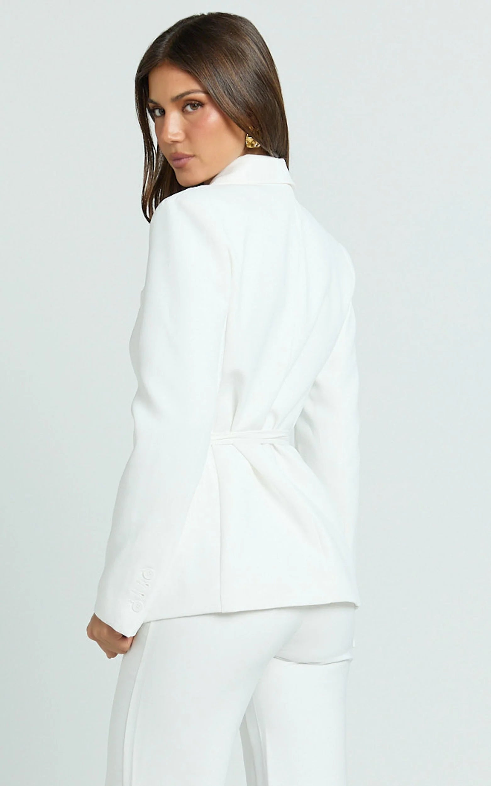 This white belted blazer snatches the waist with a cinch tie and sharp tailoring for instant polish, perfect for desk-to-drinks layering. Clean lines, strong shoulders, and a longline cut give that elevated Jackets energy while keeping it fresh and versatile.