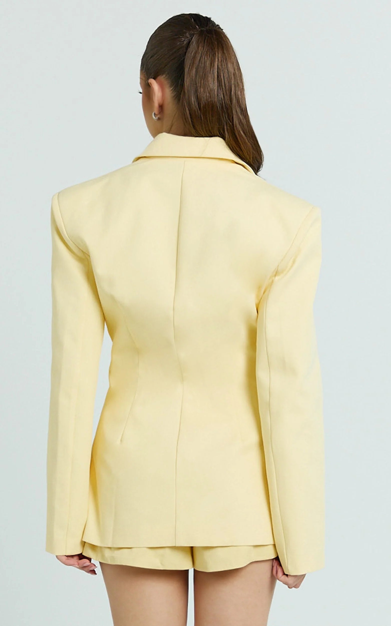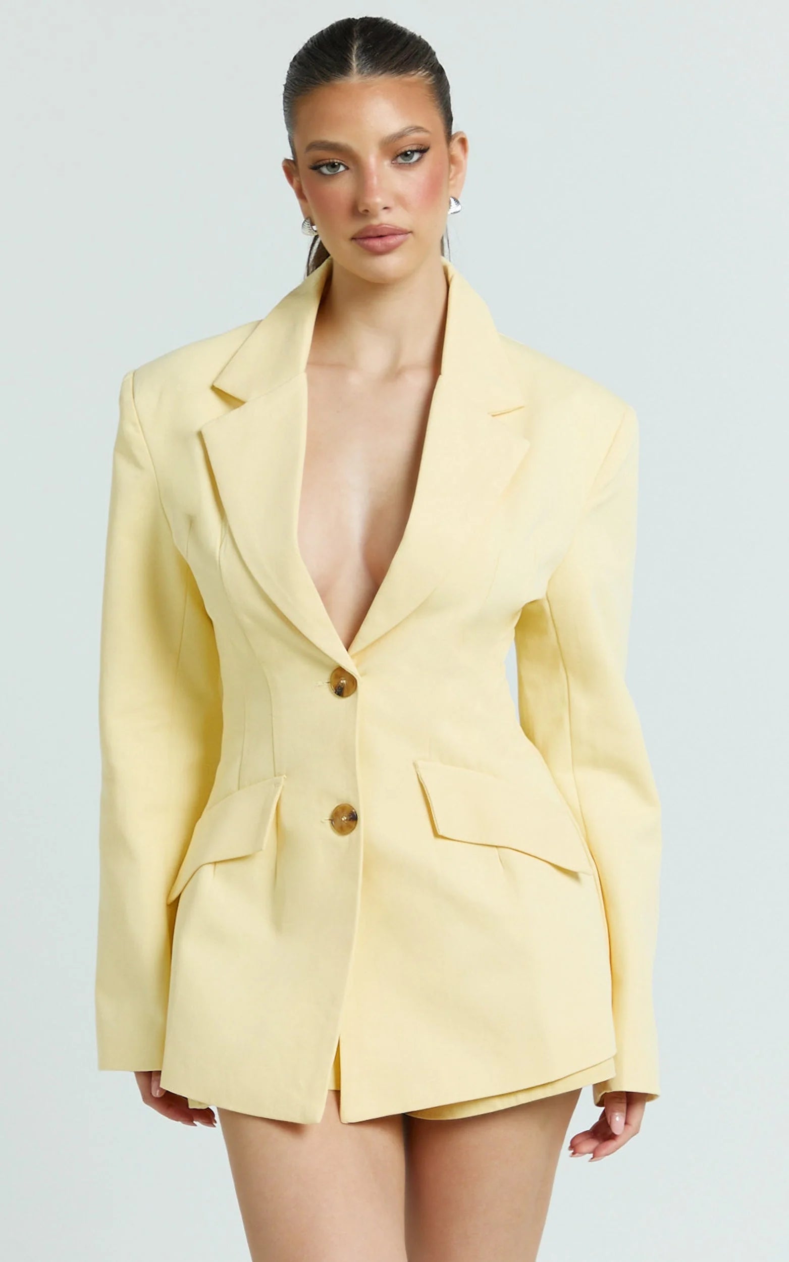 Harvey Blazer 2 Button Closure Square Hem Blazer In Lemon lands best with sleek basics and trend-led accents, think Pendant necklaces for a little shine and Oversized sunglasses for that bold finish. Throw it over a mini or denim to sharpen the silhouette, or pair with tonal pieces to lean into that monochrome mood. A confident, sunny layer that instantly elevates every outfit.