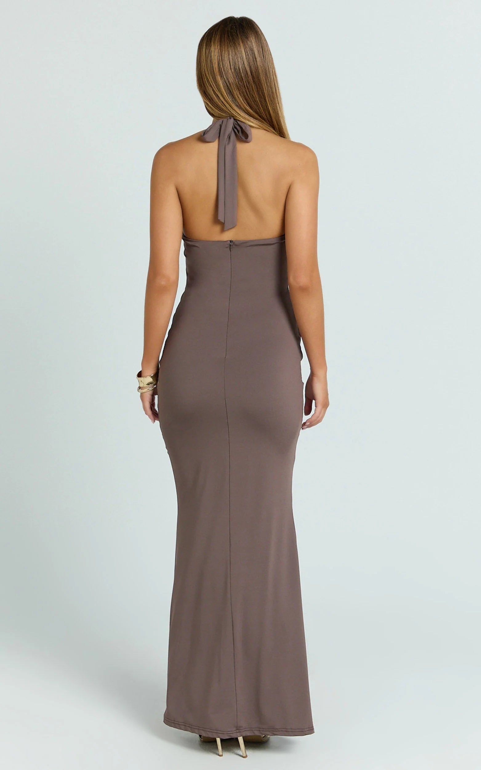 A scoop halter neck frames the decolletage, while the drape-front skirt skims the body and the back split adds just the right amount of leg. Perfect for date nights, weddings, and cocktail plans, this brown beauty pairs seamlessly with delicate pendant necklaces for a polished finish.