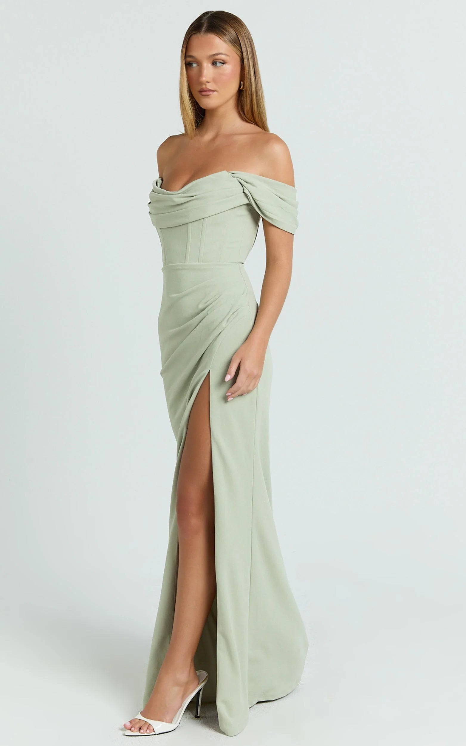 This sage green maxi brings waist-defining corset vibes and a sky-high split for legs-for-days energy, perfect for parties, weddings and every RSVP in between. The elongated silhouettes trend is having a moment, and this one nails it with a curve-hugging fit that still moves with you.