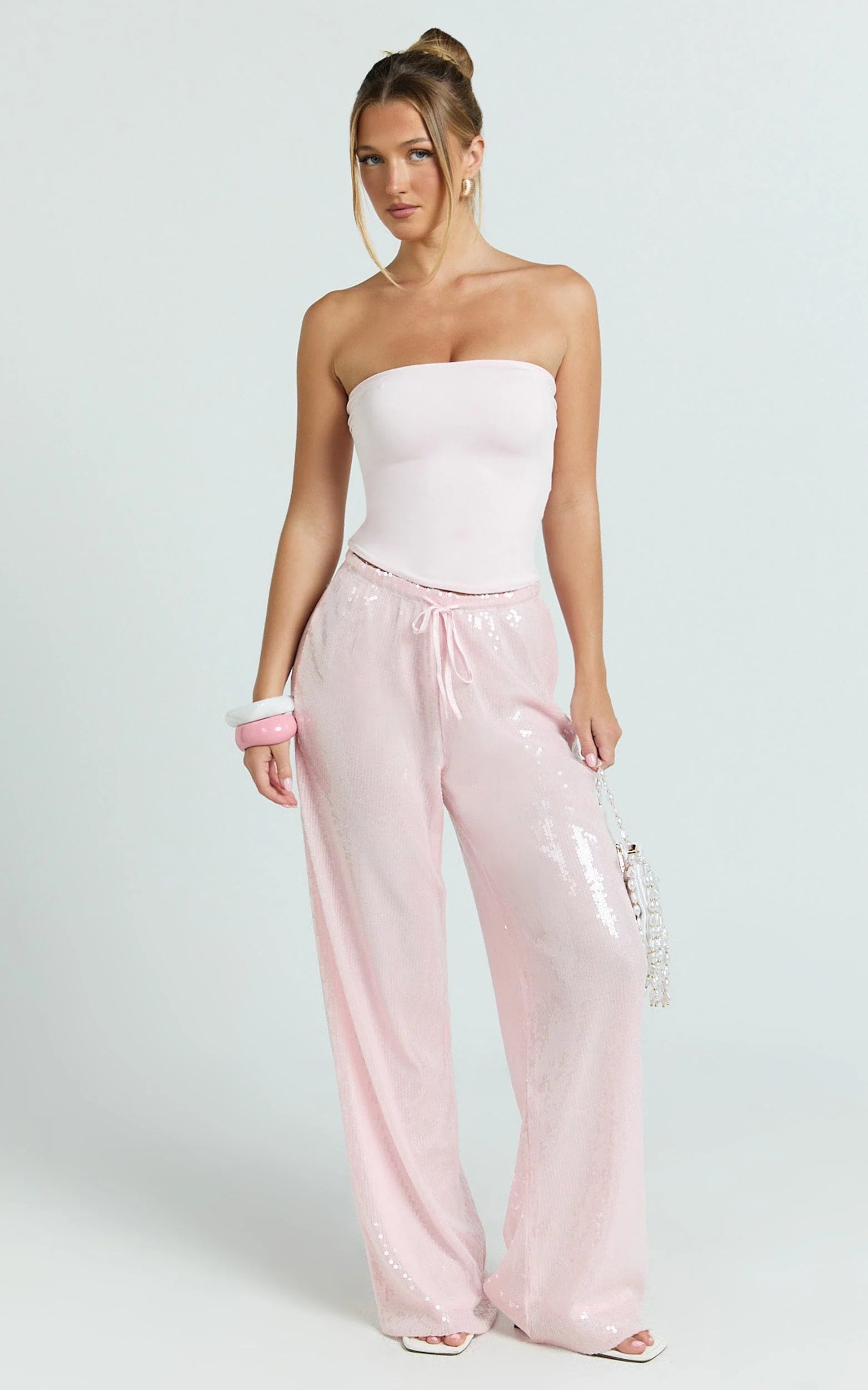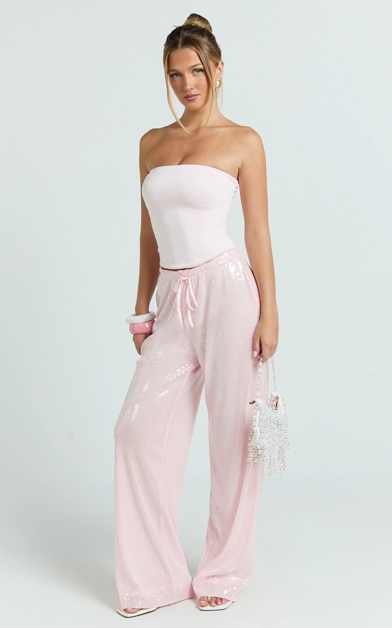 Mia Pants are the statement piece your wardrobe’s been waiting for, think playful sparkle meets off-duty cool. Style the Pants with breezy dresses or pair back with summer whites on rotation for a fresh tonal moment. Add strappy heels and a sleek clutch to keep the focus on that pink glow.