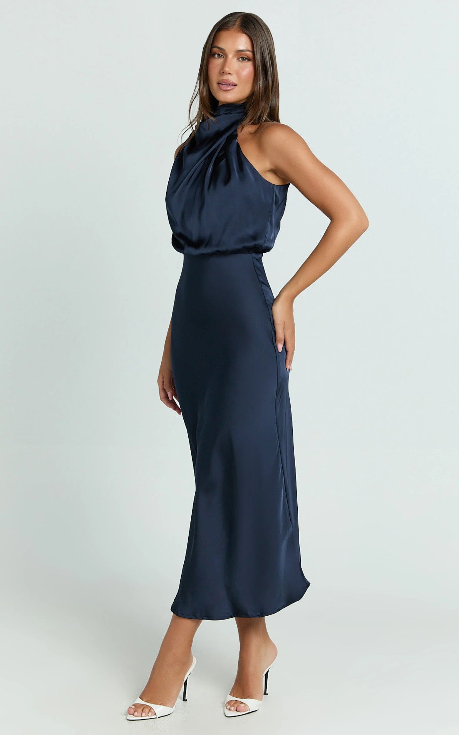 Crafted from luxurious midnight-blue satin, this slip dress radiates runway-worthy glamour with its flattering draped neckline and delicate spaghetti straps that beautifully highlight your silhouette. Its minimalist aesthetic makes it perfect for anything from chic cocktail parties to romantic date nights, effortlessly capturing contemporary style.