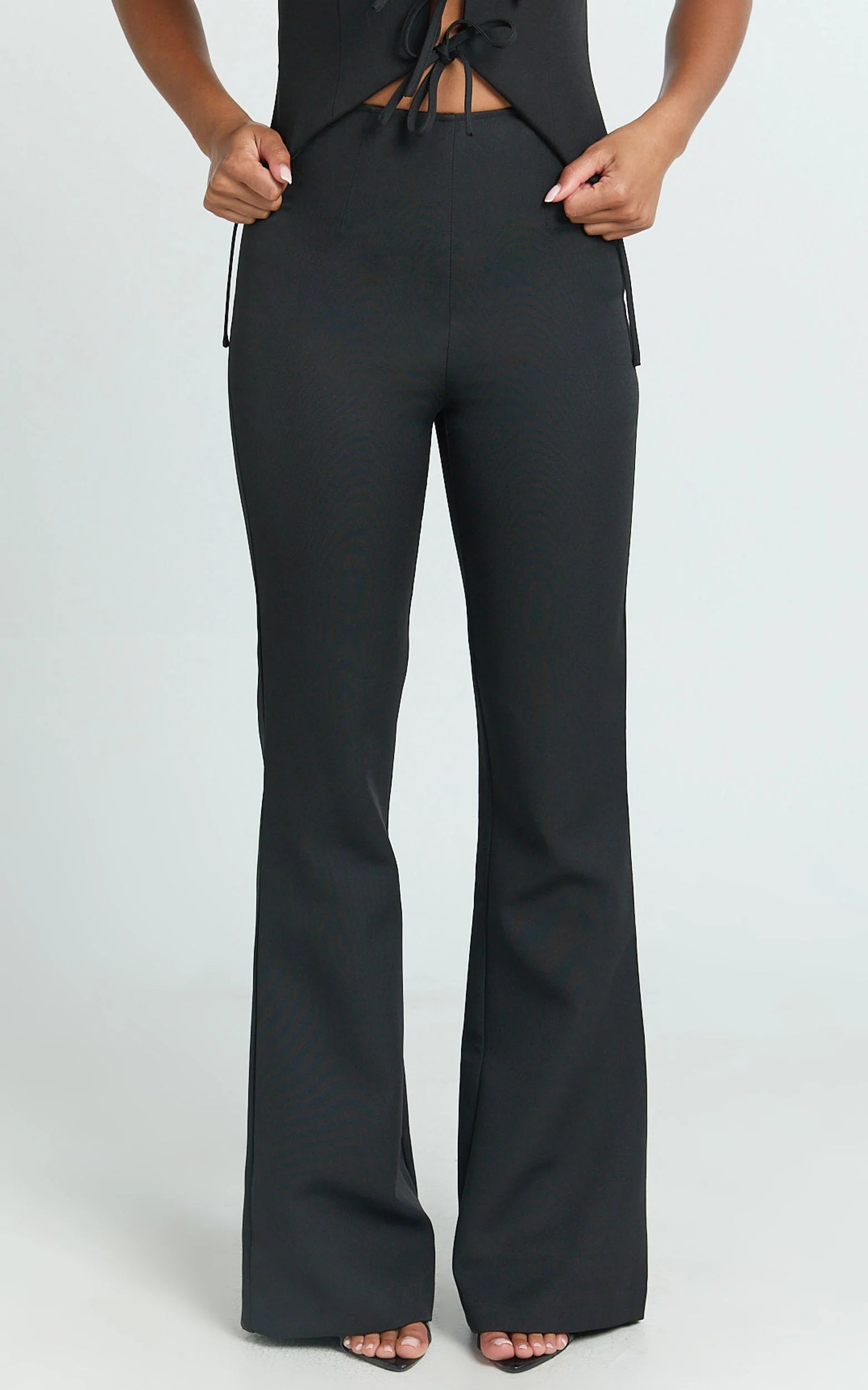 Nola Pants - Mid Waisted Pleated Flare Pants In Black elevate every outfit moment, think desk, date, and everything in between. Their flattering mid rise and flawless black finish make them a forever rotation piece. Dress them up with Patent-Leather Pumps or keep it cool with Minimalist Sandals; add a Belted Tote to complete the vibe. Classic, refined, and ready for repeat wear.