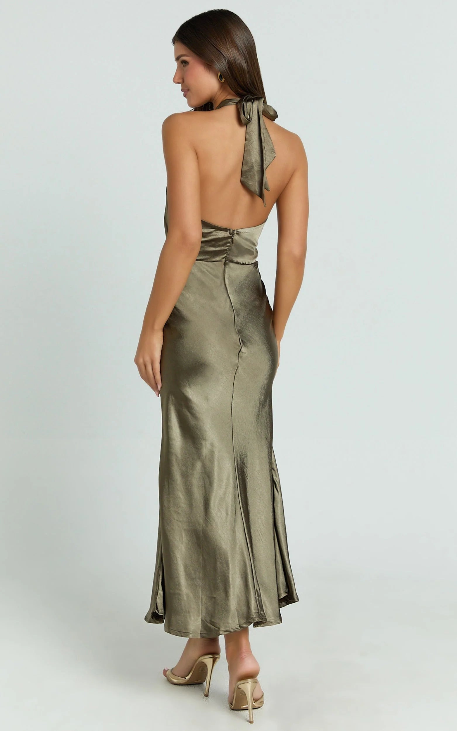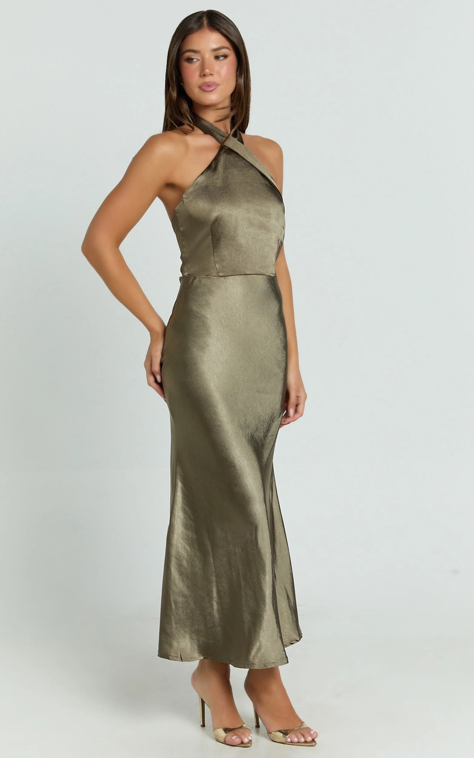 The twist halter neck frames your shoulders, the open back brings the Sex Appeal, and the fluid silhouette skims in all the right places. Consider it your go-to from dinner to dance floor, effortless Dresses energy with a luxe sheen that catches every light.