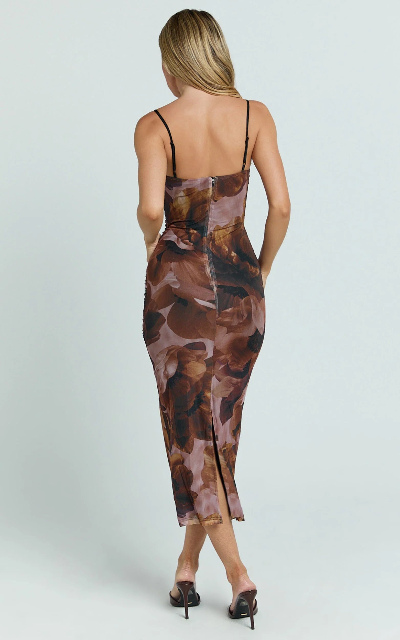 Stand out from the crowd in our Rosalez Midi Dress - a stunning strappy ruched bodycon dress that embraces your curves with confidence. This sleeveless beauty features an eye-catching ember floral print on a brown mesh fabric, making it perfect for cocktail parties or any special occasion. Made from high-quality polyester, this straight-cut midi dress is designed to flatter and empower women of all shapes and sizes. Step into the spotlight and exude effortless elegance with our Rosalez Midi Dress.