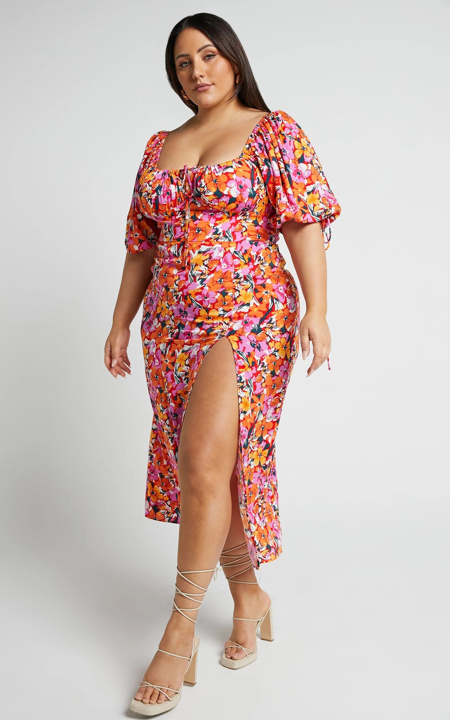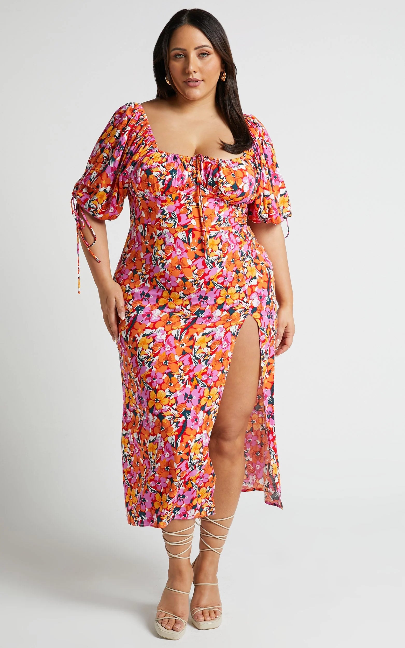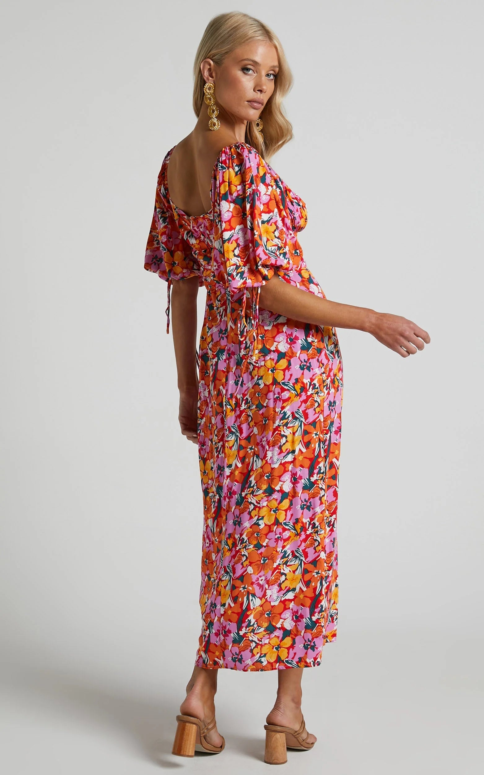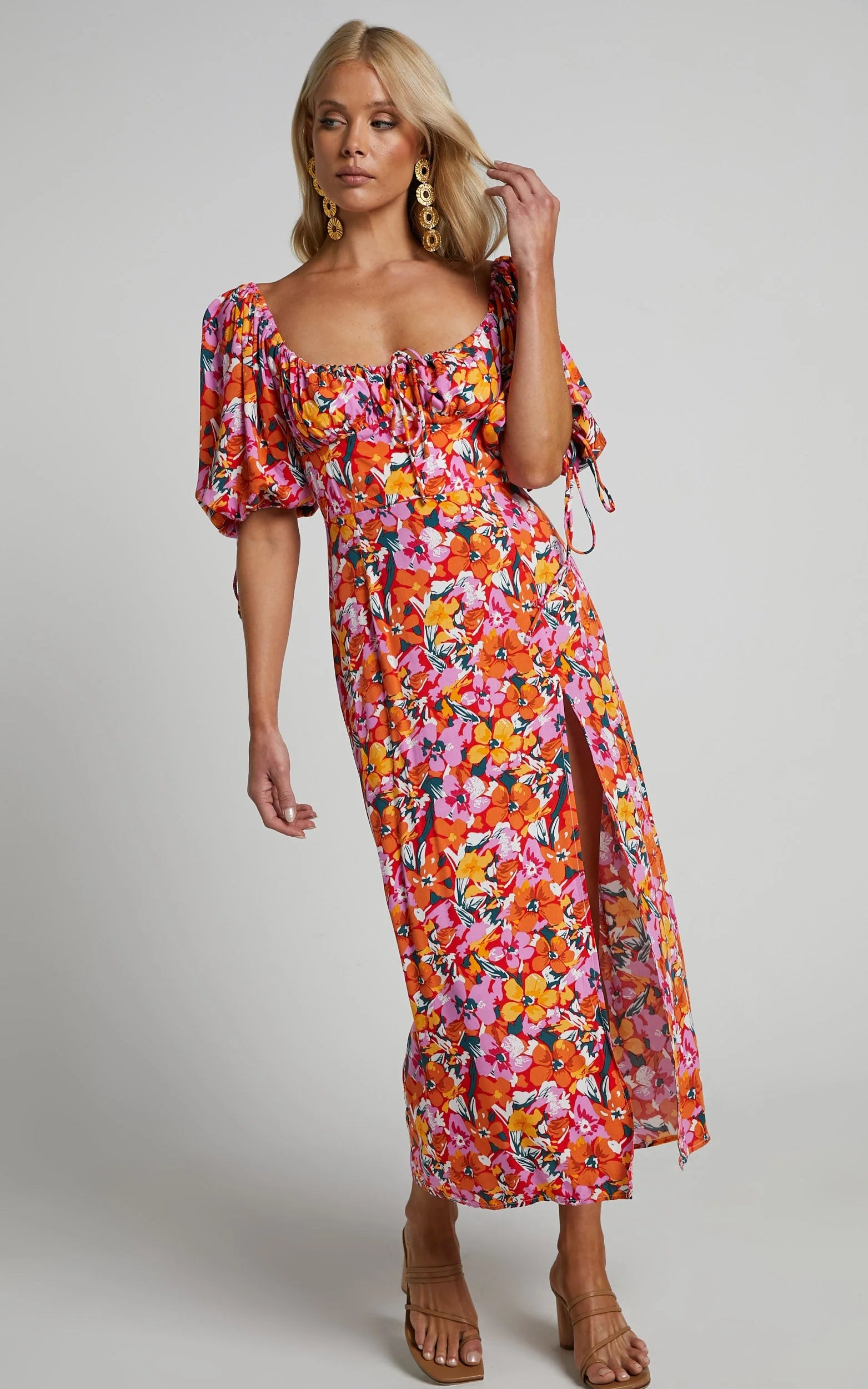 Looking for a dress that will make you feel flirty and playful? The Rosario Midi Dress is here to brighten up your wardrobe! This slip-on style day dress features a ruched bust, puff sleeves, and a sweetheart neckline. With its stunning spring floral pattern in orange hues, this midi-length casual dress is perfect for any occasion.
