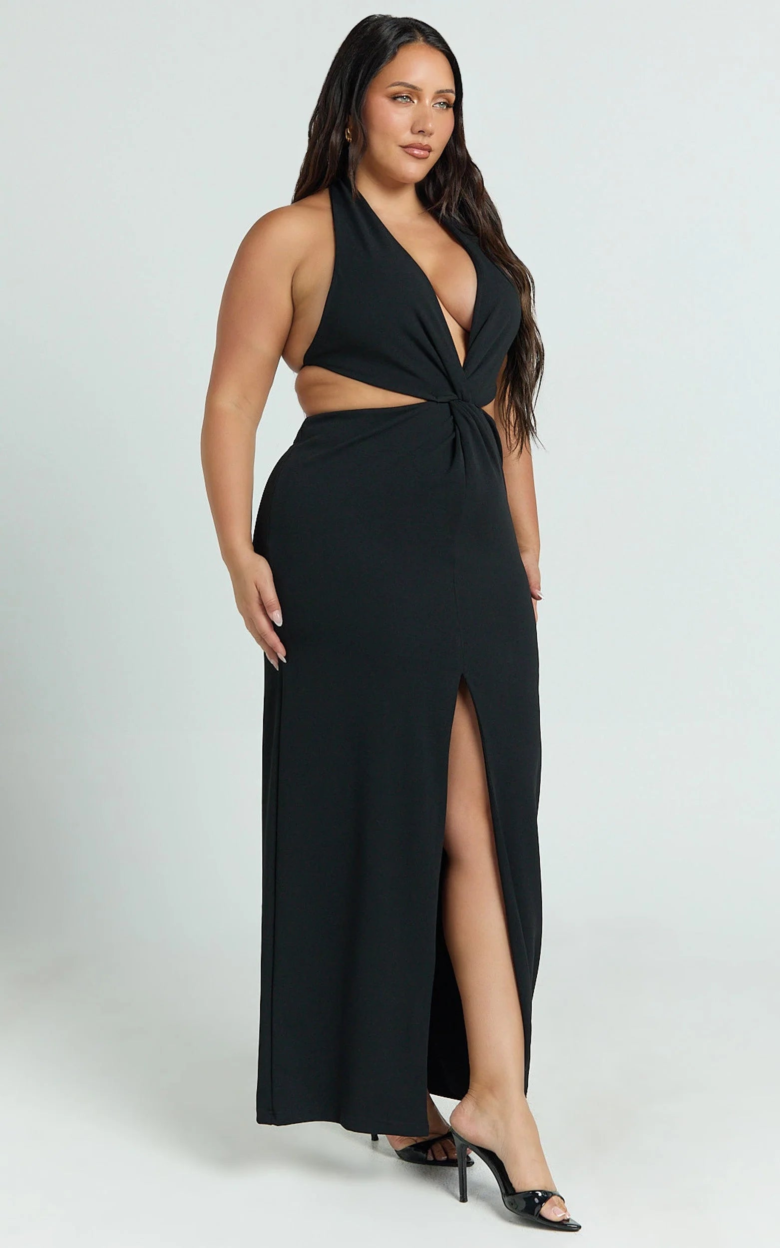 Make a statement in the Rose Maxi Dress - Plunge Halter Front Split Dress in timeless Black. Designed for the modern woman, this dress is the epitome of elegance and empowerment. Crafted from high-quality crepe and polyester, it promises an A-line silhouette that gracefully skims your figure, enhancing your natural beauty without compromising on comfort.